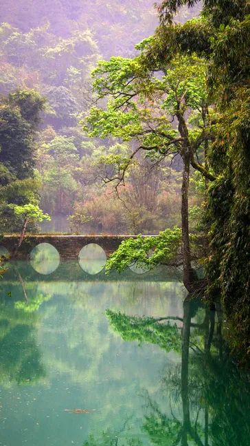 两侧的古树、竹林,桥下碧绿清澈的涵碧潭,