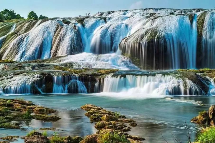 黄果树瀑布群中最宽的瀑布,是一个高21米、宽达105米的天然坝型瀑布,平水时,水流清澈,瀑布水层沿着和缓的瀑面,均匀地撒开,如一层薄薄的、半透明的面纱,又如一面面张开的素绢扇面,在阳光下泛着银光,故有人戏称为“新娘面纱”。但当洪季来临,白水河中由于携带了大量山洪冲下来的泥沙而呈土黄色,陡坡塘瀑布便消失了往日平水时的秀色,而变得异常凶猛雄壮。这里也是《西游记》中唐僧师徒四人牵马过河的取景地。
