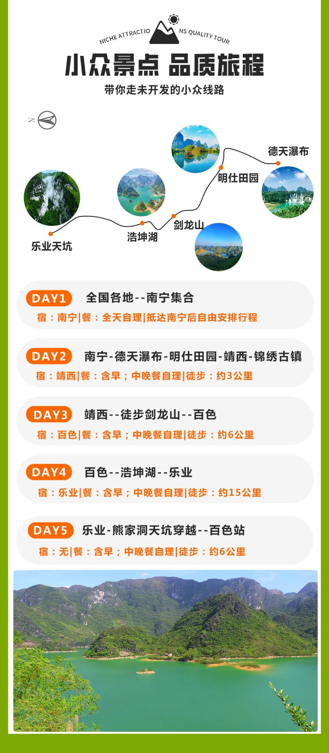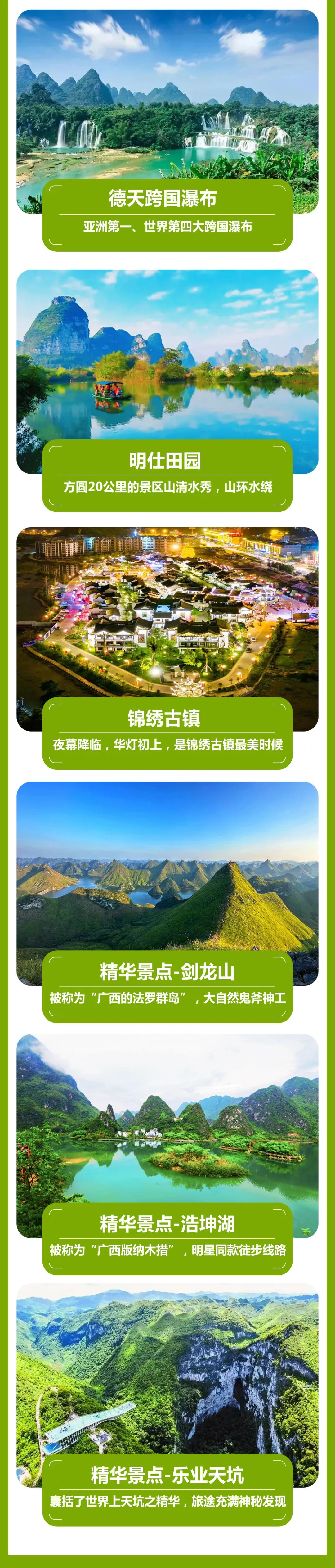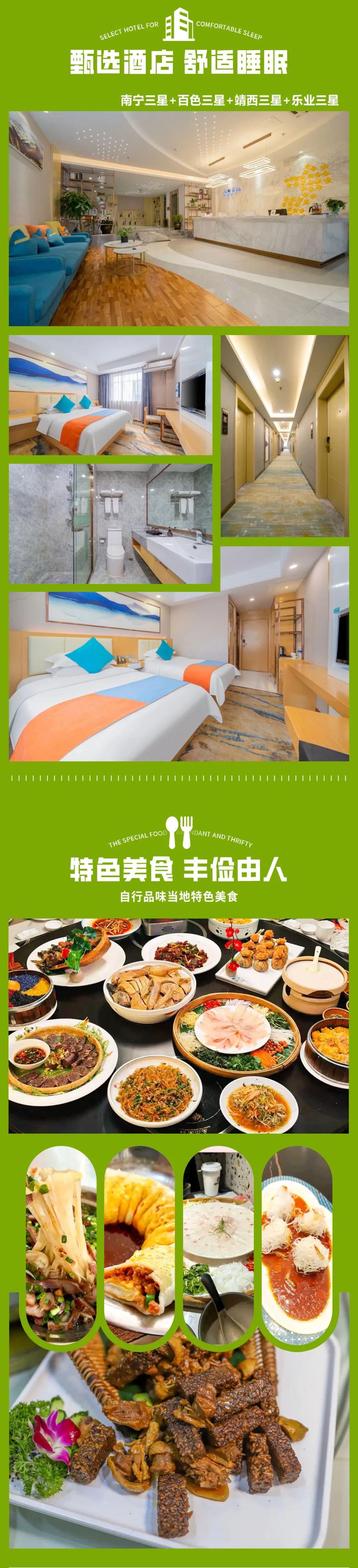 3)浩坤湖、乐业天坑、剑龙山正常进入是不需门票,如有收门票则自理4)各地到南宁往返大交通