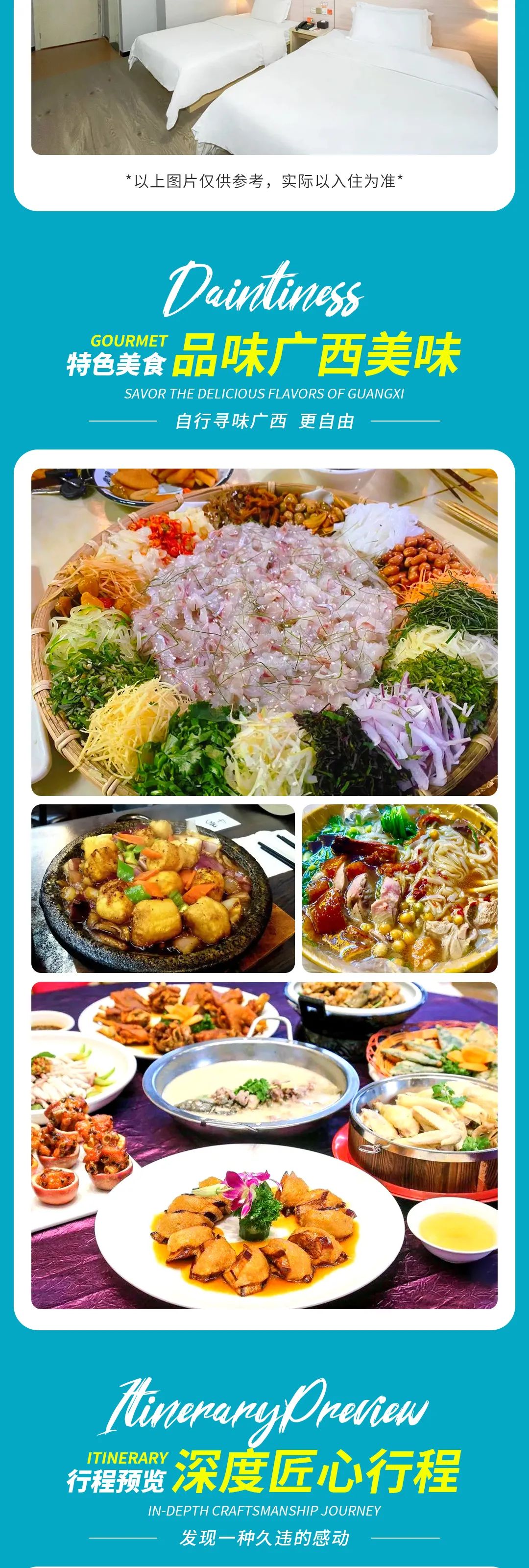 4、如酒店或景区或餐厅有任何问题,请现场提出,不受理返回后提出关于酒店、餐厅等问题投诉。5、行程中涉及的相关景点景色因受天气、季节变化等情况影响,无法保证与活动介绍中的展示保持一致,游客报名即表示知晓并理解本情况。6、领队有权因天气情况或者不可抗拒因素进行-行程的适当调整.参与人员须服从领队的安排;如个人不遵守活动规定和领队的指挥或活动场地的安全规定,地方习俗、自行其事而造成的后果,除自负其责之外,还应对应此给他人造成的损失
