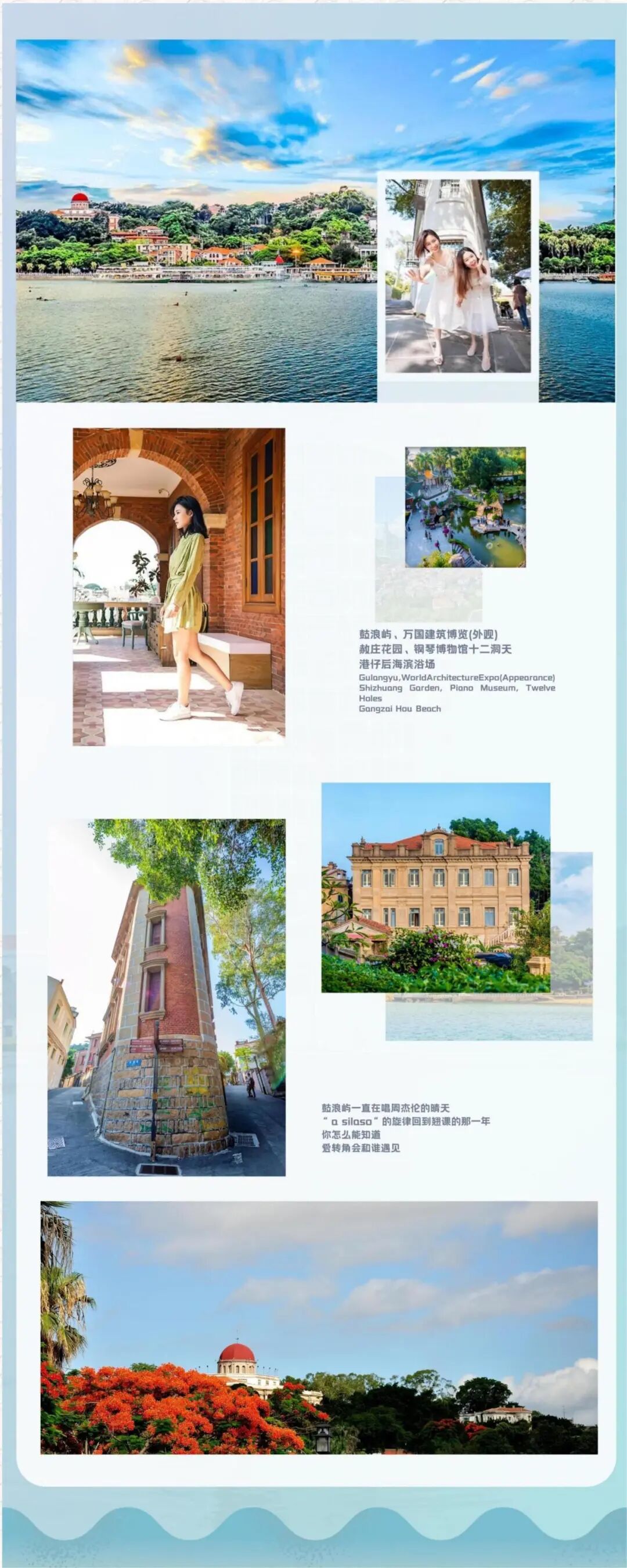小贴士 穿衣指南:看过那么多客片,鼓浪屿是最容易出片的地方,在服装方面是最好选择的,只要记住要拍小清新的照片就要避免深色系的衣服,黑色首先就被pass了,其他就按照自己穿搭风格来就好,鼓浪屿不仅适合小姐姐旅拍,闺蜜情侣甚至是亲子家庭都可以拍出大片的视觉感受。