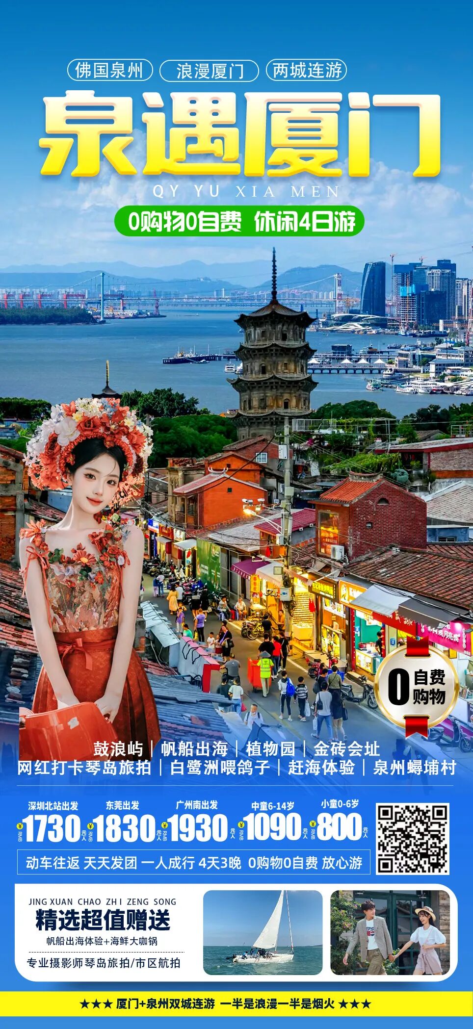 泉州古城、帆船出海、白鹭洲、鼓浪屿、网红打卡琴岛旅拍/市区航拍、环岛路、赶海体验、植物园、白鹭洲喂鸽子。