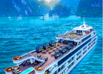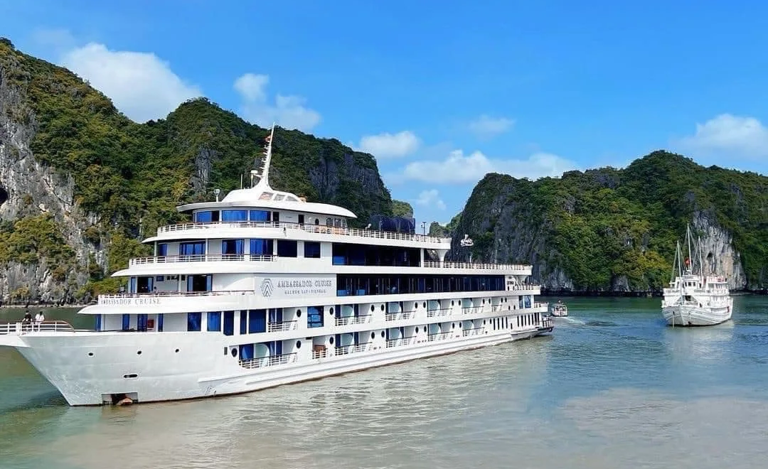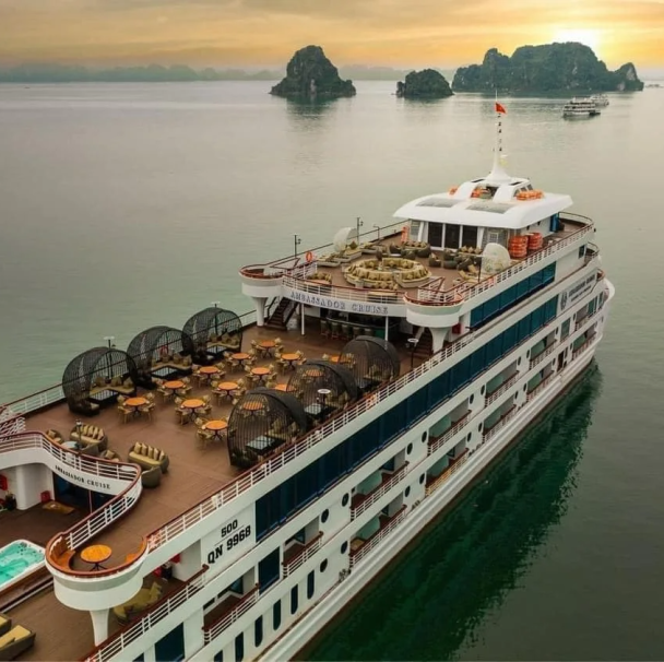 ◇早餐后乘坐【ambassador-cruise 号或sealife-octopus号或Ha Long Princess Day Cruise 号或金刚石号或同级别】,畅游海上桂林—下龙湾。一边聆听抒情的音乐,边观赏下龙湾的美景,享用约 100 种高级菜肴,(含自助午餐+自助下午茶)。倘佯于万顷碧波之中;漫游被国际教科文组织评为世界自然遗产之一的“海上桂林”—下龙湾,在 1500多平方公里的海面上、耸立着 3600 多座大小不一、千姿百态的喀斯特地貌的山石、更以其“海美、山幽、洞奇”三绝而享誉天下。◇前往【惊讶洞】惊讶洞的特色是它很象天上宫殿的辉煌美丽。这里有经数百万年造化形成的,多彩多样的巨型石乳,特别还有龙王形象及其极富人文性传说的文化蕴味。洞内的中心有四个大柱子支撑着,从柱脚到柱顶有许多奇形怪状的钟乳石,有的如鱼有的似鸟,有的像人类生活画面等等,中间和四周都有着多彩多样的,巨大雄伟,精致柔美的石块石乳,在灯光的照耀下,那些石乳忽然发亮反射着金刚石似的五彩光影。