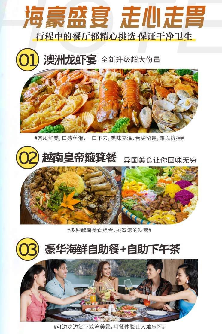 1、全程用餐7正5早,豪华游轮自助午餐+1正特色澳洲龙虾宴+3正中式风味餐+1越南皇帝餐+1越式围桌,早餐含于房费内、越南当地旅游餐厅跟国内餐厅稍有区别,根据餐桌大小一般可分为6-8人一桌,具体以实际安排为准;