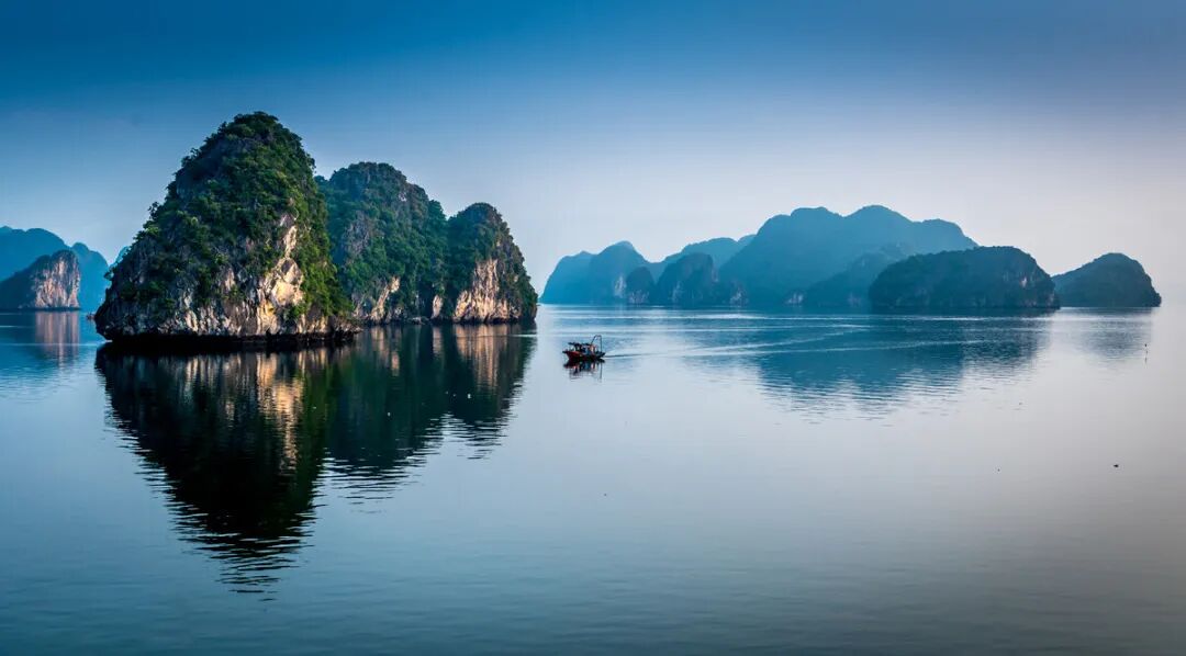 下龙湾海域中有典型的喀斯特地貌的小岛,千姿百态、奇峰异岛把下龙湾点缀得美奂绝伦更以其海美、山幽、洞奇三绝而享 誉天下) 斗鸡岛、狼狗石、香炉山等数不胜数的风景尽收眼底。