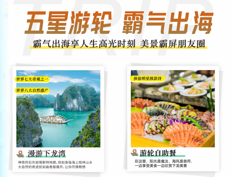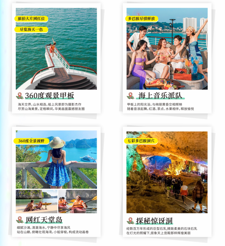 特别声明:如因越南雨季台风季节,地接社可在不减少景点的情况下,调整游客的参观顺序,使游客可以参观到下龙湾海上桂林,如果天气原因未能参观下龙湾及天堂岛的,则替换为陆上景点。