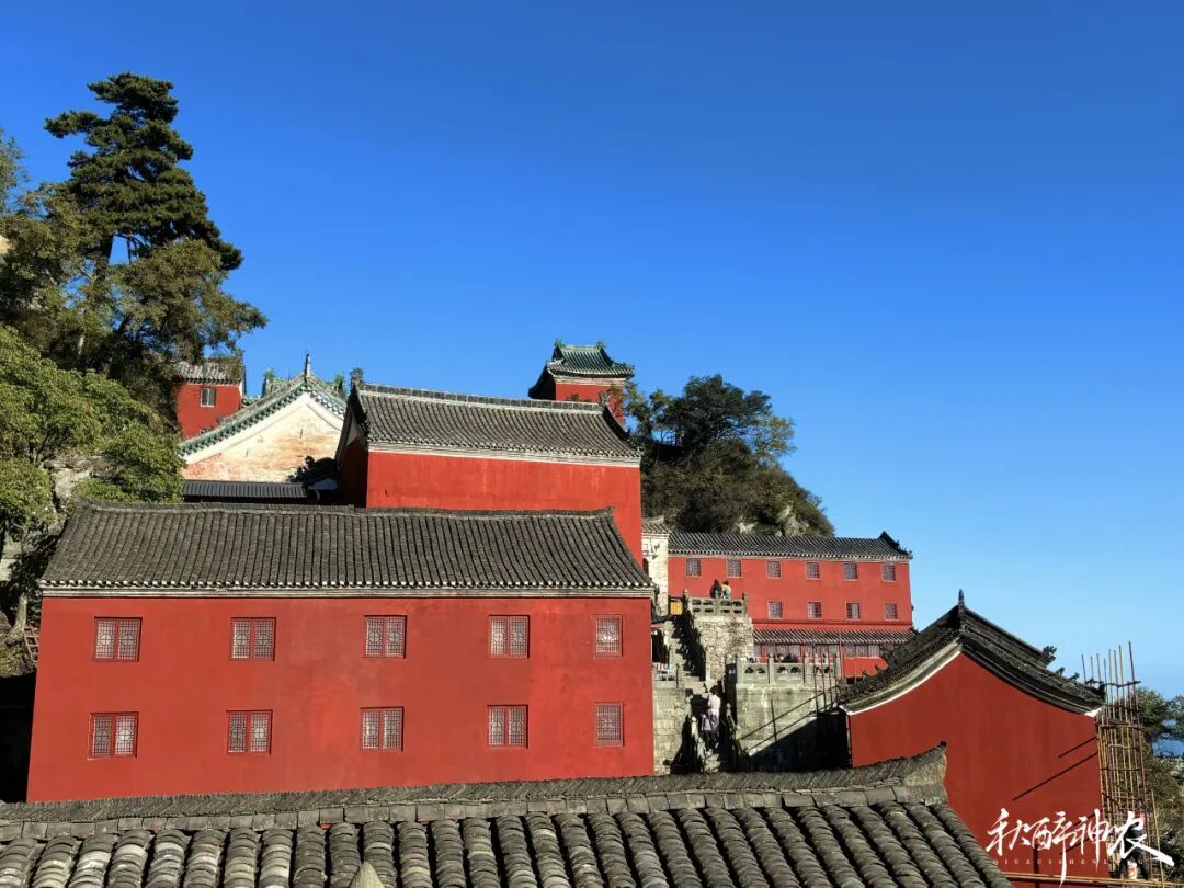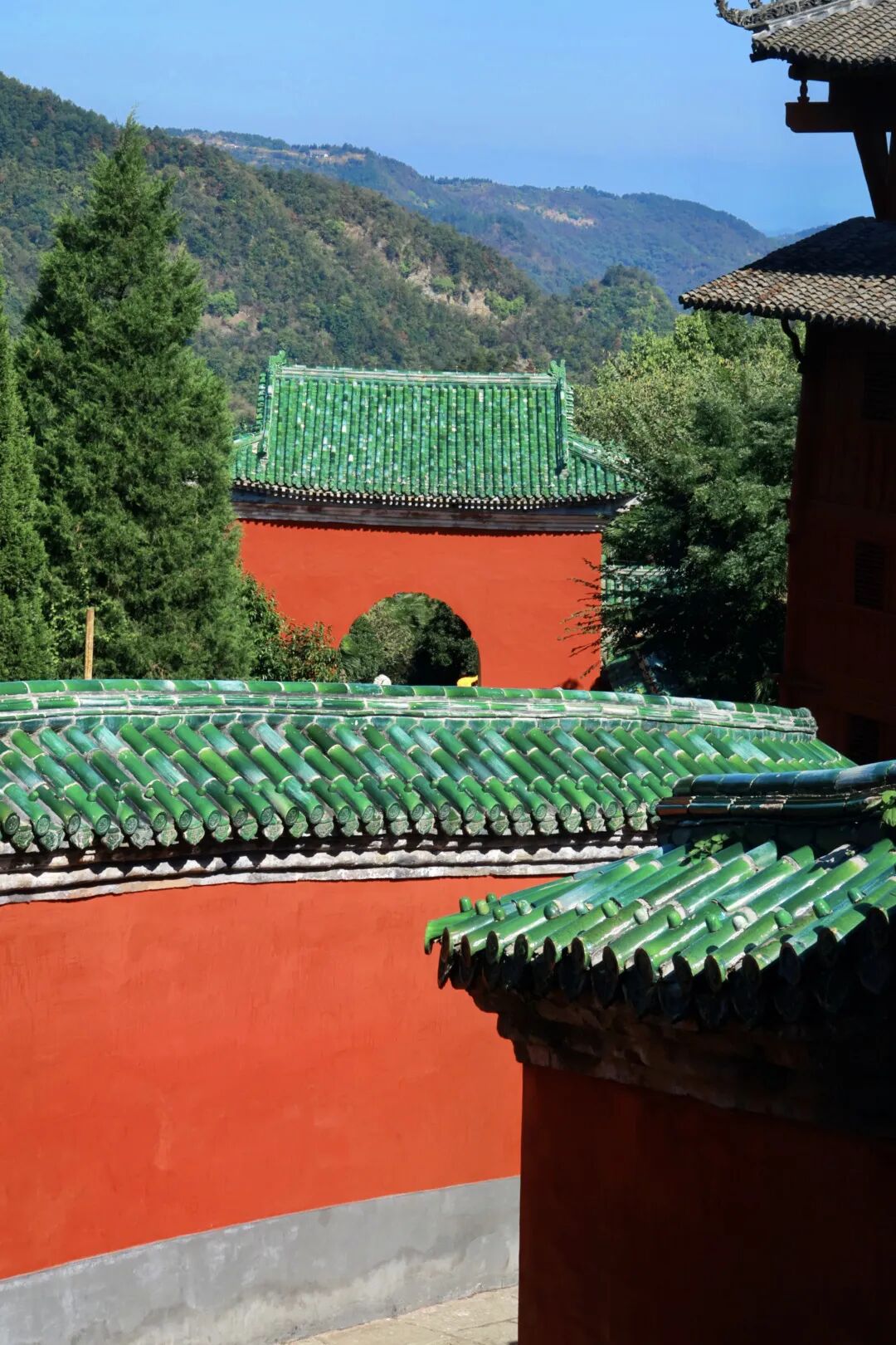 “一里四道门,十步九回环”登600年复真观,穿行朱砂红墙蜿蜒的“九曲黄河墙”,仰望“一柱十二梁”古建奇观,触摸真武大帝少年修行的传奇印记。