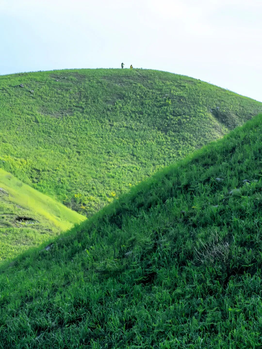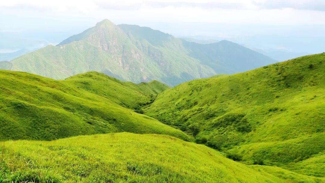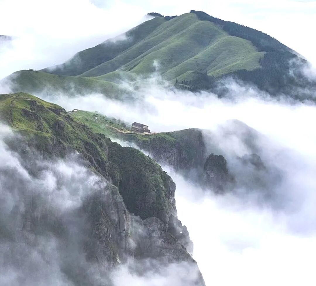 满眼翠绿的高山草甸,云雾飘渺的山巅