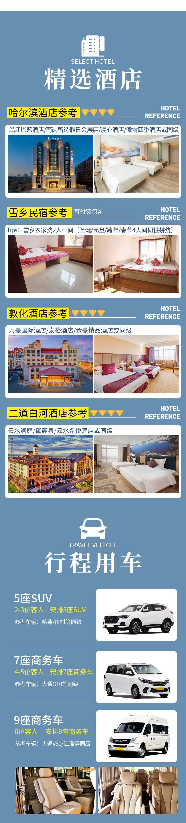 1、住宿:哈尔滨4钻酒店标间1晚,敦化4钻酒店标间1晚,雪乡农家炕2人一间(圣诞元旦跨年春节团期同性4人间拼炕),二道镇4钻温泉酒店标间1晚;
