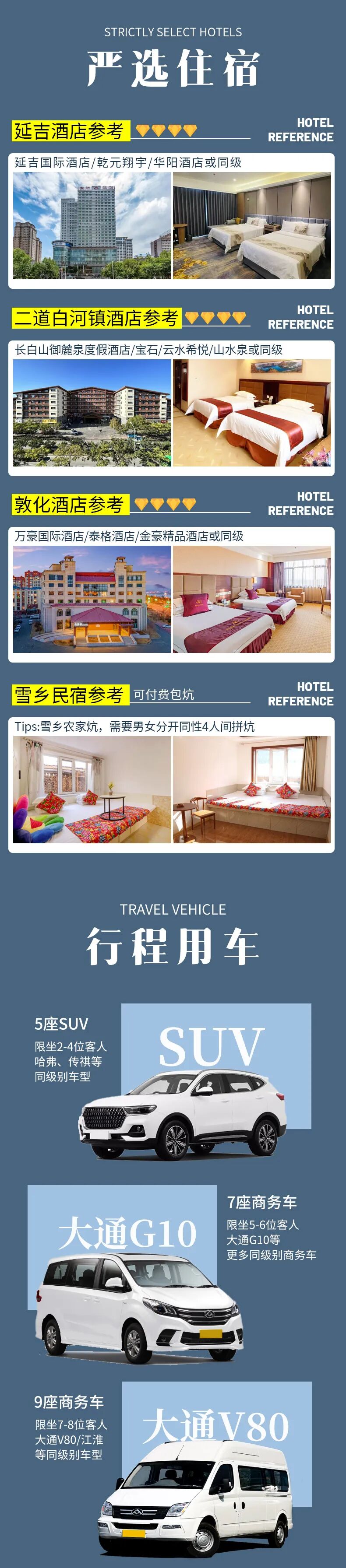 3、用车:2-4客人用5座SUV,5-6客人用7座商务车,7-8客人用9座商务车(小团副驾驶及前后座位置需要轮流乘坐,望悉知);4、门票:图们中朝友谊桥门票、长白山雪岭门票、雪乡门票+往返环保车、长白山北景区全含(门票+往返环保车+摆渡车+天池倒站车)、雪乡滑雪3小时包含雪鞋雪板雪杖使用(滑雪时间从取雪具开始计算,到还雪具结束);