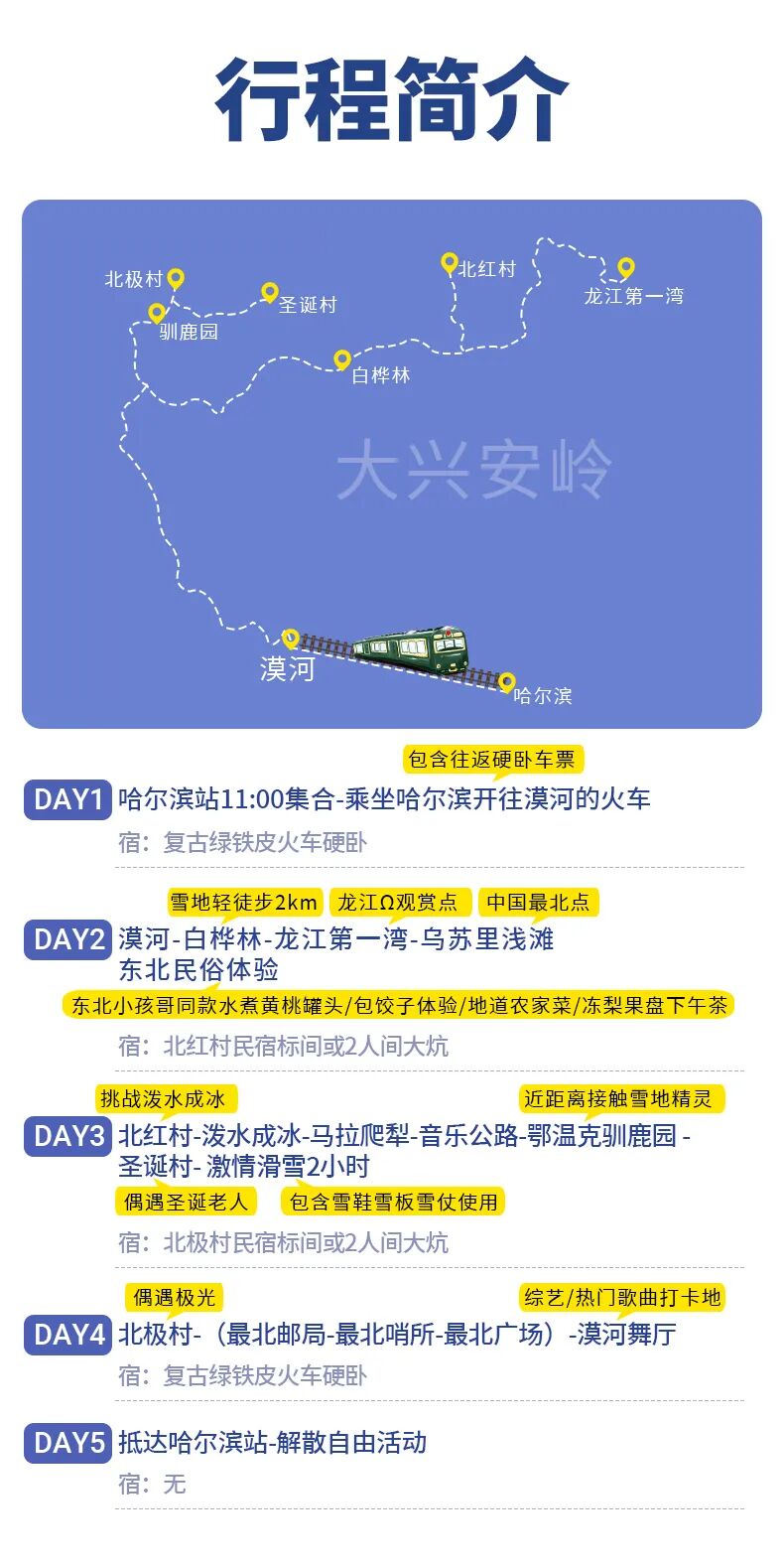 3、火车条件有限,敬请谅解。参考车次:K7039(17:18/次日10:07)或K7041(18:05/次日12:23)或 K5174(12:20/次日08:28)或K5171(12:55/次日08:28)具体车次和时间以出票为准。4、哈尔滨冬季打出租车较为困难,一般都是拼车,大家出去玩的时候建议使用网约车软件打车。