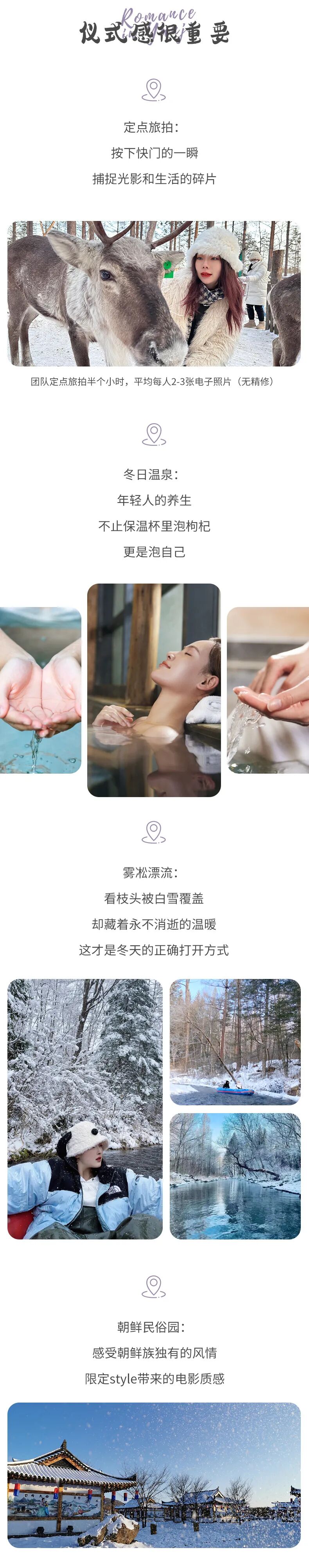 延吉-朝鲜民俗园-雪岭漫步(117KM,车程约2.5小时)-雪地摩托-网红驯鹿-二道白河(62KM,车程约1.5小时)