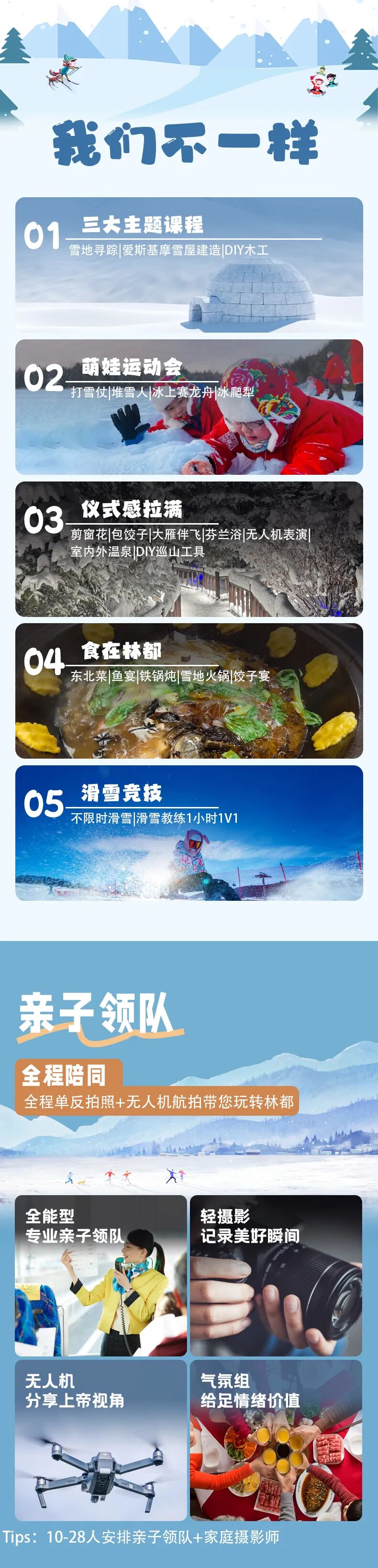 1、温泉体验一次;2、滑雪教练1小时1V1;3、林海雪原穿越体验一次(含向导费);4、制作巡山工具体验一次(含研学老师指导+材料费)