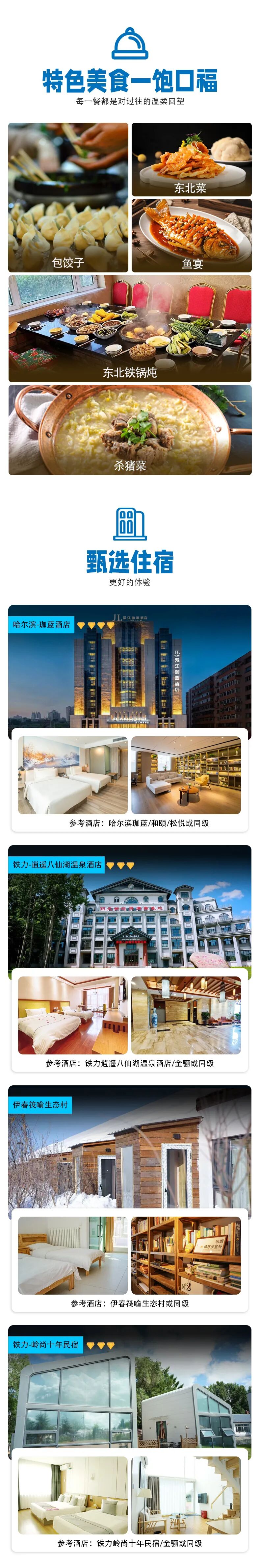 2、 用餐:包含5顿早餐,8顿正餐(东北菜+鱼宴+铁锅炖+雪地火锅+荒野厨房+包饺子)