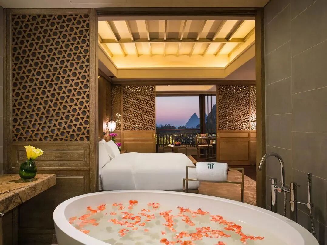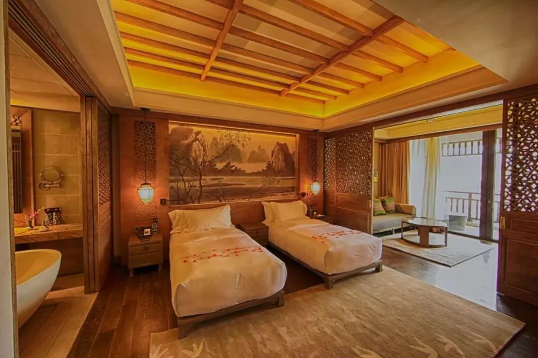 早餐后前往游览【金子岭风景区】(游览时间约90分钟),以山水生态为背景,以独特的船家文化、妈祖文化、过山瑶文化为底蕴,将金子岭景区建设成为人文文化(历史文化、佛教文化)及休闲文化氛围浓郁的文化旅游休闲园区。登上金子岭,远眺著名三江汇合(茶江、漓江、荔江),一览平乐县城全景风光。后前往【阳朔十里画廊】远眺月亮山风光,品尝正宗桂林米粉。如诗如画自然美景尽收眼底,沐浴在迷人的自然田园风光中,别样感受阳朔的山水美景。前往入住国际顶级奢华五星度假村【悦榕庄•奢华度假酒店】,坐落于漓江之畔,静靠田园牧歌般的江水,彻底远离城市喧嚣,在这里,可以让您沉浸于质朴而浪漫的世外桃源。可以在度假村内邂逅孔雀、羊驼喂养、壮乡绣球制作、天然香薰蜡烛手工制作、自行车骑行、日落仪式下午茶、漓江畔网红恒温泳池等多重活动体验(自费套票已赠送)!还独家尊享悦榕庄殿堂级spa/悦榕餐饮的独家专属优惠(需提前预约)!邂逅《好想好想你》网红拍摄地!奢享悦榕庄梦境,房间设计质朴而优雅,每个房间装点着格子窗、水墨画、黑木、竹子,选用大理石镶嵌工艺,配备大地色系,和谐之美将大自然与您紧紧相连。