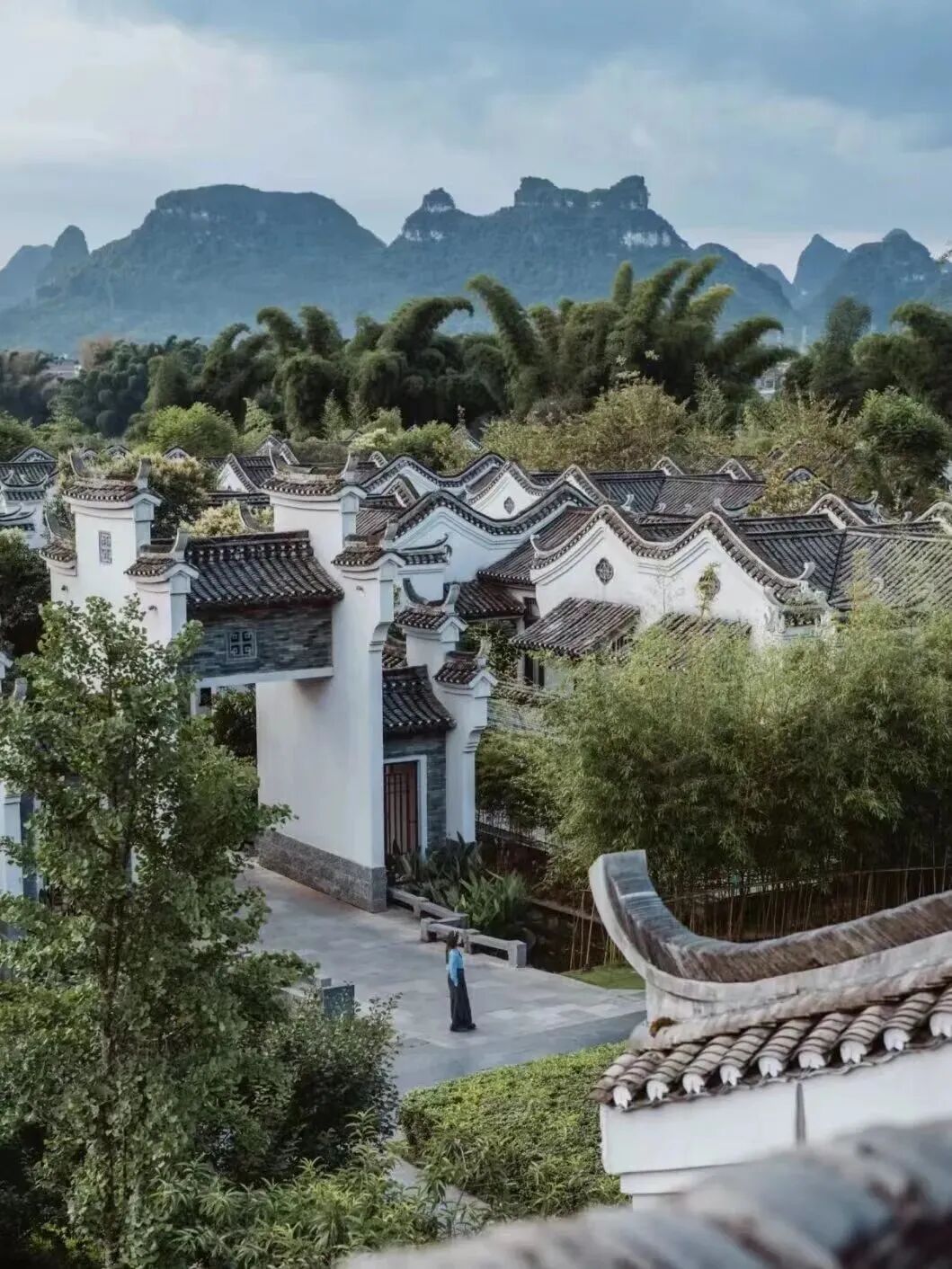 阳朔悦榕庄设计质朴优雅,百余间舒适客房及别墅都充满当地建筑特色,度假村由一至二层的建筑围成庭院,借鉴了桂北民居小青瓦、坡屋面、白粉墙、木格窗、吊阳台、青石墙裙等经典元素。
