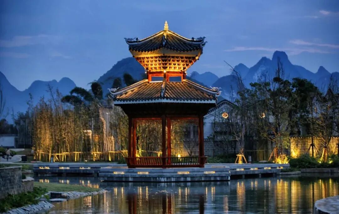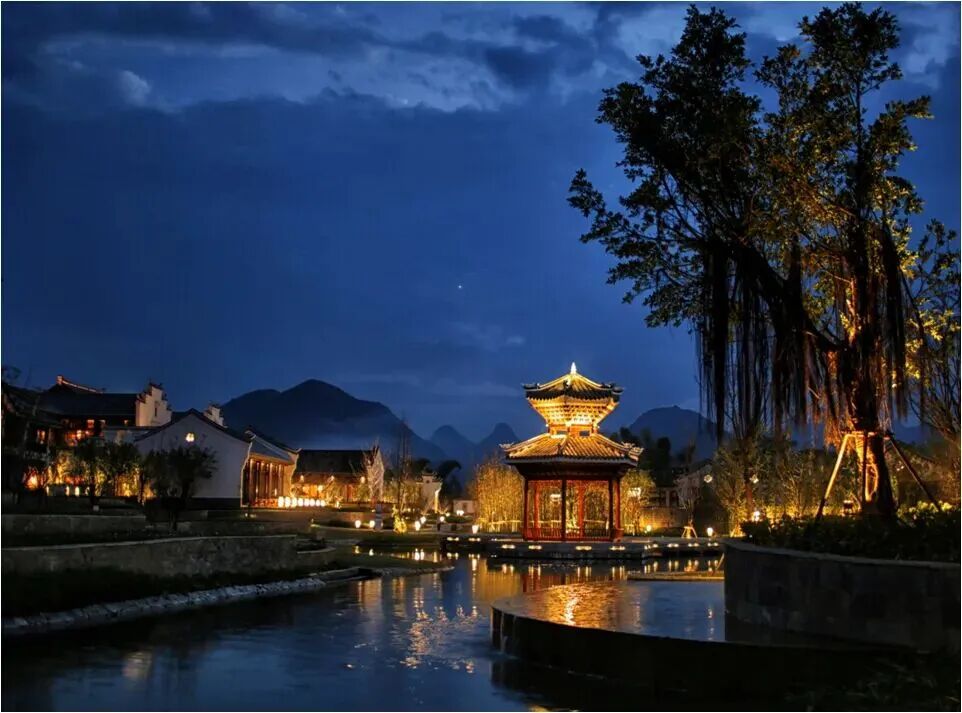 色彩淡雅朴实,园林与水体穿插布置于其中,和青山绿水的优美环境相得益彰。