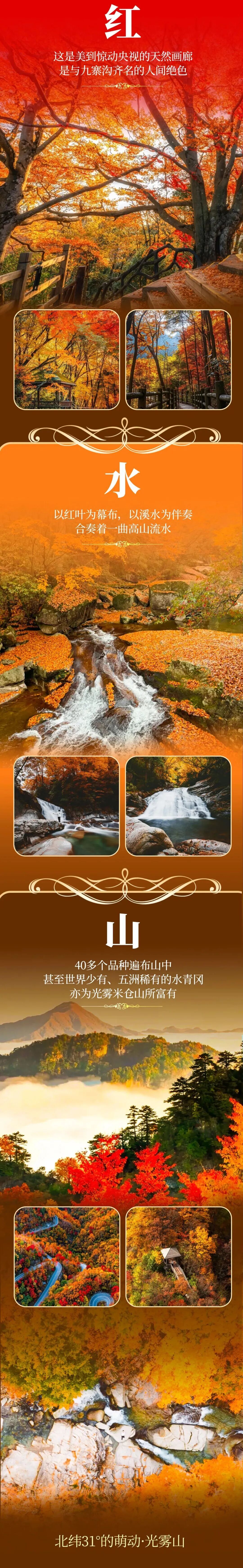 酒店早餐后,乘车前往光雾山镇(车程约2小时),自费前往游览光雾山核心观赏地,醉美红叶第一山【米仓山国家森林公园】(游览时间约3小时),米仓山国家森林公园位于四川盆地东北边缘的南江县北部,地处秦巴山区(秦岭—大巴山)的米仓山南麓。东、北与陕西省汉中市南郑区相邻,南抵南江县沙坝乡、关坝乡、寨坡乡和杨坝镇,西靠广元市旺苍县,并同光雾山国家重点风景名胜区相邻。北距汉中市约70公里(经铁炉坝山门),南距巴中市约136公里(经陈家山),西距广元市约216公里(经陈家山),古有“巴西外户,蜀北岩疆”之称。面积40155公顷,活立木总蓄积240万立方米,森林覆盖率为97.3%,被称之为“天然氧吧”。米仓山国家森林公园始建于1995年,被评为“中国红叶之乡”。 秋天是公园最美的季节,观叶树种有枫类、槭类、水青冈、椴树、桦木、杨树等,仅水青冈的分布面积就约4000公顷,水青冈为山毛榉科,水青冈属,全世界目分布有10-14种,亚洲7种,中国5-6种,而米仓山分布就有4种,是地球上水青冈属植物起源地和现代分布中心之一,更是世界上水青冈分布最集中、面积最大的地区。前往深度游览【黑熊沟】,黑熊沟内水量丰沛,水质优良,清冽可鉴,鱼翔浅底,沁人心脾。河床整体由花岗岩构成,奇石密布,短瀑迭翠,蜿蜒流淌,碧潭相连,五彩斑斓。两岸山体构造奇特,岩洞丛生,千姿百态,幽邃神秘,长十数公里。后前往漫步【大小兰沟自然保护区】大小兰沟的落叶阔叶混交林植被、生物群落结构、自然景观和生态环境均保存完好,被誉为“森林百宝箱”、“生物万花筒”和“珍稀物种种质基因库”。 后游览【天然画廊】(米仓山观赏点根据当天时间和景区拥挤情况安排顺序和增减,敬请注意),是光雾山大坝景区的核心景观区。该景点以原始巴山水青冈林为主体,总面积达680公顷,秋季层林尽染的红叶景观可媲美额济纳旗。后乘车返回巴中,晚餐后入住酒店休息。