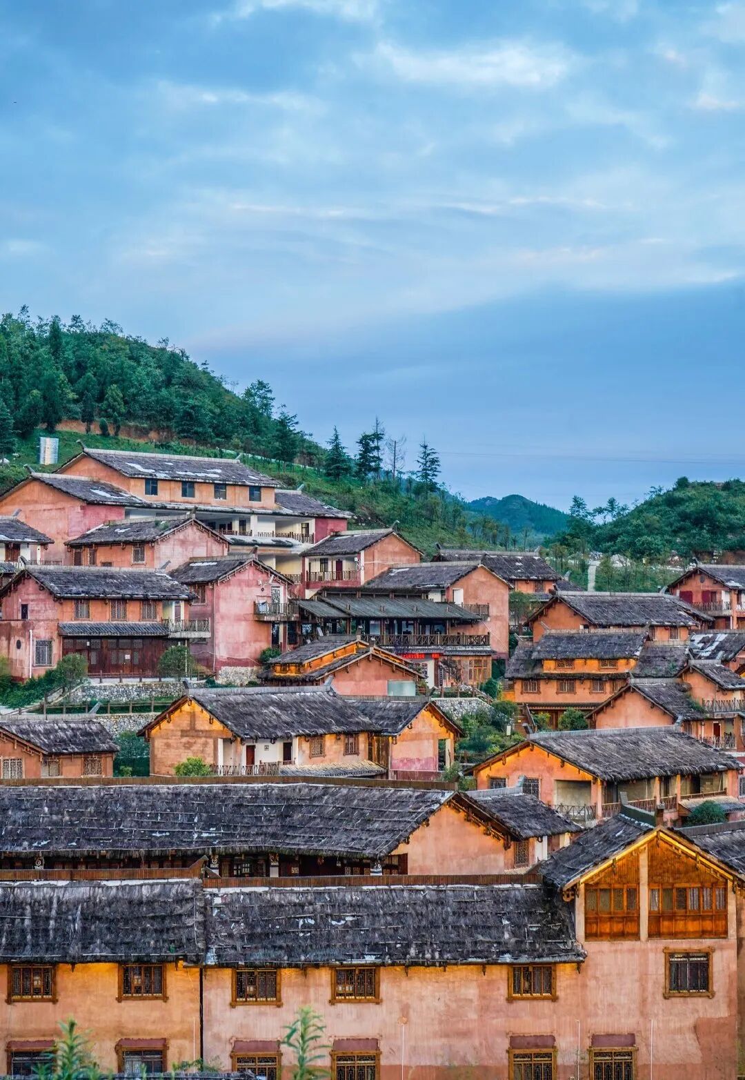 外土红墙、具有彝族特色的房屋、民宿、彝族塑像……