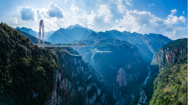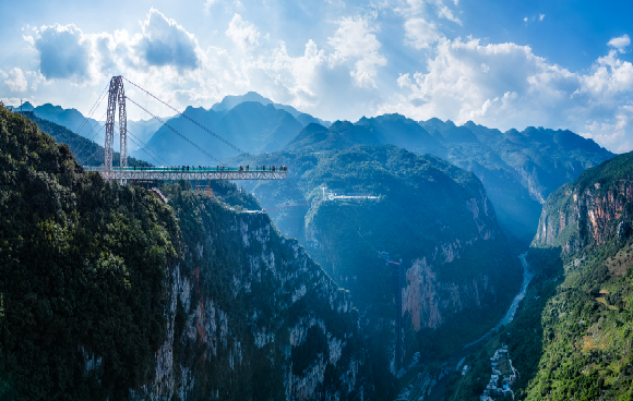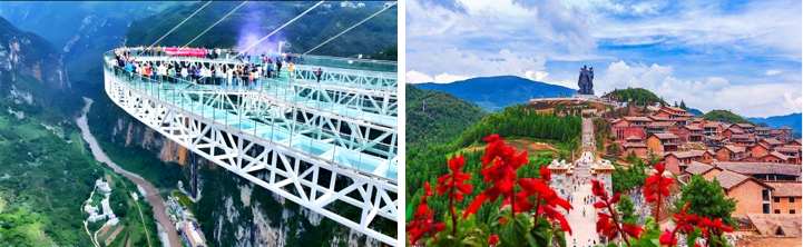 早餐后,乘车前往游览以险、奇、秀著称,被誉为“云南的科罗拉多”的【尼珠河大峡谷景区】(车程约3.5小时,游览约2.5小时,必销套餐含单程电梯+单程索道+云端玻璃桥+悬崖栈道+520观景台)。尼珠河大峡谷景区位于云南省宣威市普立乡,上至木通河大桥,下至腊龙岔河,是北盘江上的一条支流,是宣威境内最恢弘、最秀美、最神奇的大峡谷,是"世外桃源"的真迹,是与世隔绝的"人间仙境"。藏在深闺人未识的尼珠河景区由尼珠河大峡谷、以官寨沟为代表的入峡沟壑、世外桃源尼珠河村组成,川流不息的尼珠河及两岸的万丈绝壁隔断了这里与外界的联系,也隔断了外面对这里的认识,这里封存着一个美丽而神秘的遗失世界,这里是一片保留着一切原生态元素的旅游“处女地”。后乘车前往游览【海坪彝族风情小镇】(车程约1.5小时,游览时间约1小时),“海坪”之名源于古老的彝语,意为辽阔的开阔地。在这片广袤的土地上,一个历史悠久的民族繁衍生息,他们就是海坪村的彝族人。这个村寨,承载着古老民族的智慧与历史,是彝族文化的重要传承之地。参观【千户彝寨】、【世界鞭陀文化博物馆】、【天下第一锅】,外观彝族标志性建筑【九重宫殿】、彝族始祖——【希幕遮】,从支格阿鲁雕塑处起前往“朝圣之路”,一路游览了解彝族的历史文化。