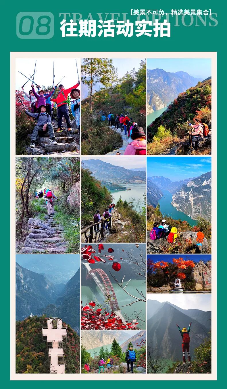 只要不是大暴雨,行程都是可以正常走,我们会准备一次性雨衣,有户外雨衣的话可以自备。秋雨蒙蒙的时候,巫峡上空云雾翻腾,十分壮观,“除却巫山不是云”。并且有三段徒步可以选择半程或者游玩景区。