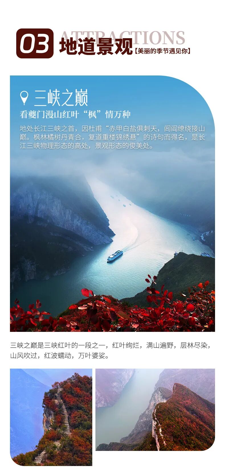 三峡之巅,地处长江三峡之首,因杜甫“赤甲白盐俱刺天,闾阎缭绕接山巅。枫林橘树丹青合,复道重楼锦绣悬”的诗句而得名,是长江三峡物理形态的最高处,景观形态的最美处。