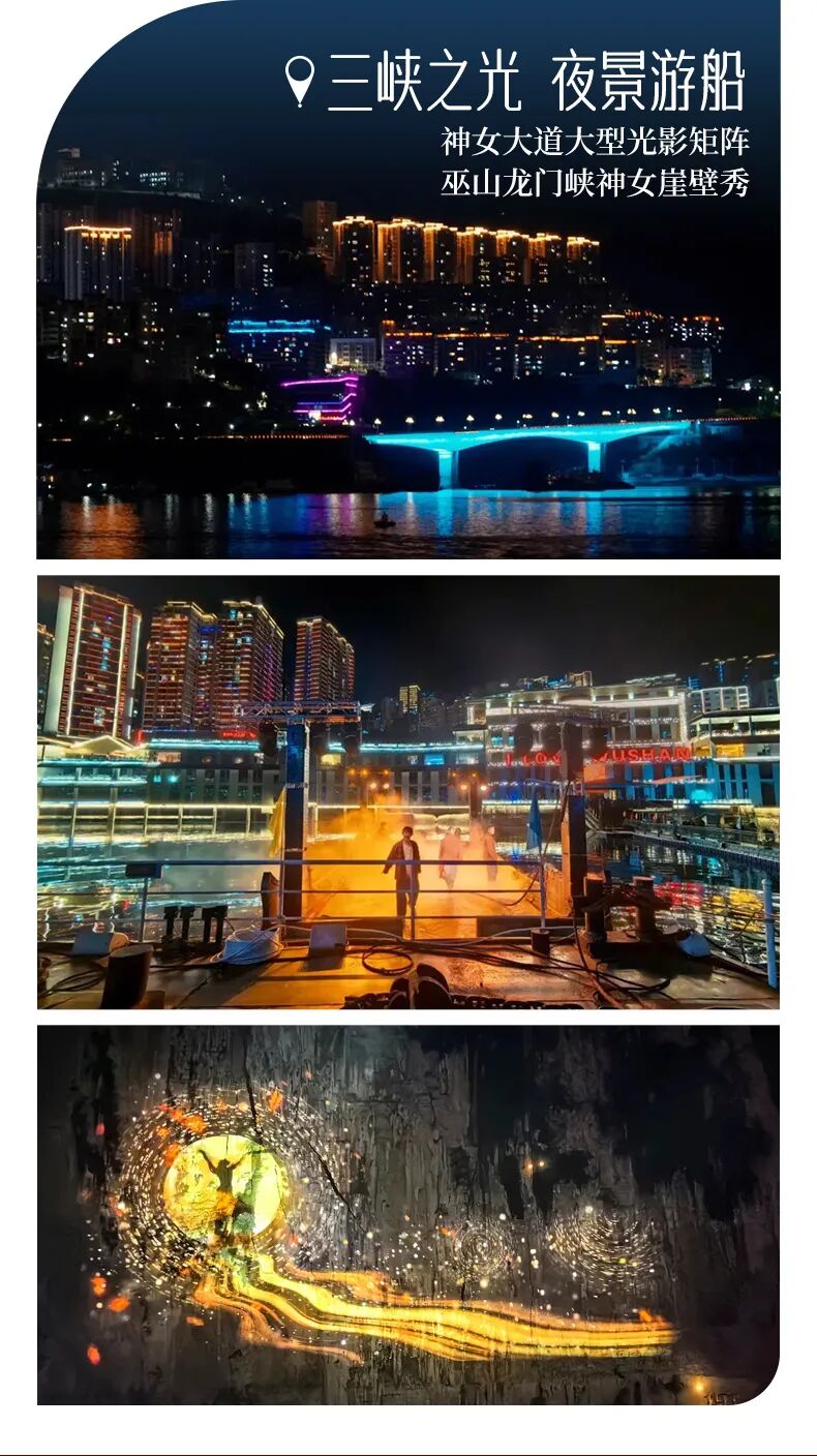 船游过程中包含:非遗民俗歌舞互动表演;神女大道光影矩阵;南陵春晓诗词演绎;巫山龙门峡神女崖壁秀。