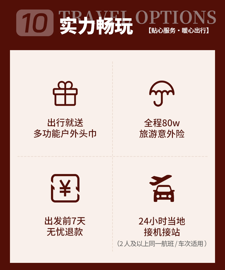 6.杂物:墨镜、保温杯、晕车药等杂物自行备好,另外建议也可以自备洗漱用品;