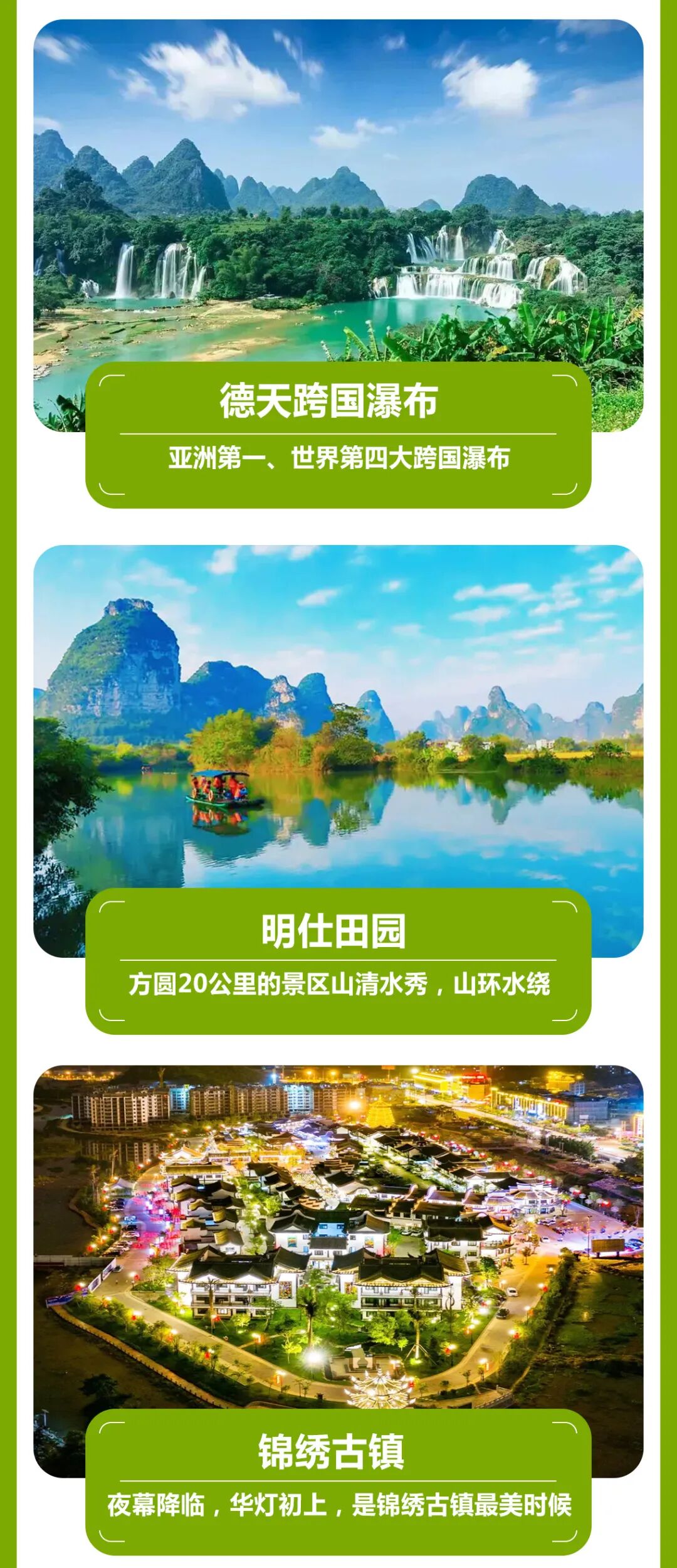 由“壮乡水寨”+“边关小镇”组成的锦绣古镇,是一个富有深厚历史文化底蕴,高人气、高档次的吃住行游为一体的旅游特色小镇。
