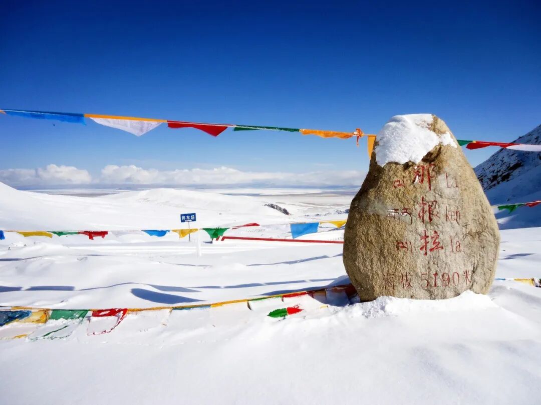 那根拉山口海拔5190米,是跨过念青唐古拉山脉去纳木错的山间通道,属于号称生命禁区的海拔5000米以上的山口。在这里可以眺望纳木错。这是一个景点,也是一个休息点。山口立了一块标明海拔高度的石碑,山口的玛尼堆上挂满了经幡。从山口向北望去,远远可以看到碧蓝碧蓝的纳木错。如果身体还行,就站在山口,遥望四野,你的心里顿时会涌起雄浑、苍茫、辽阔的感觉。