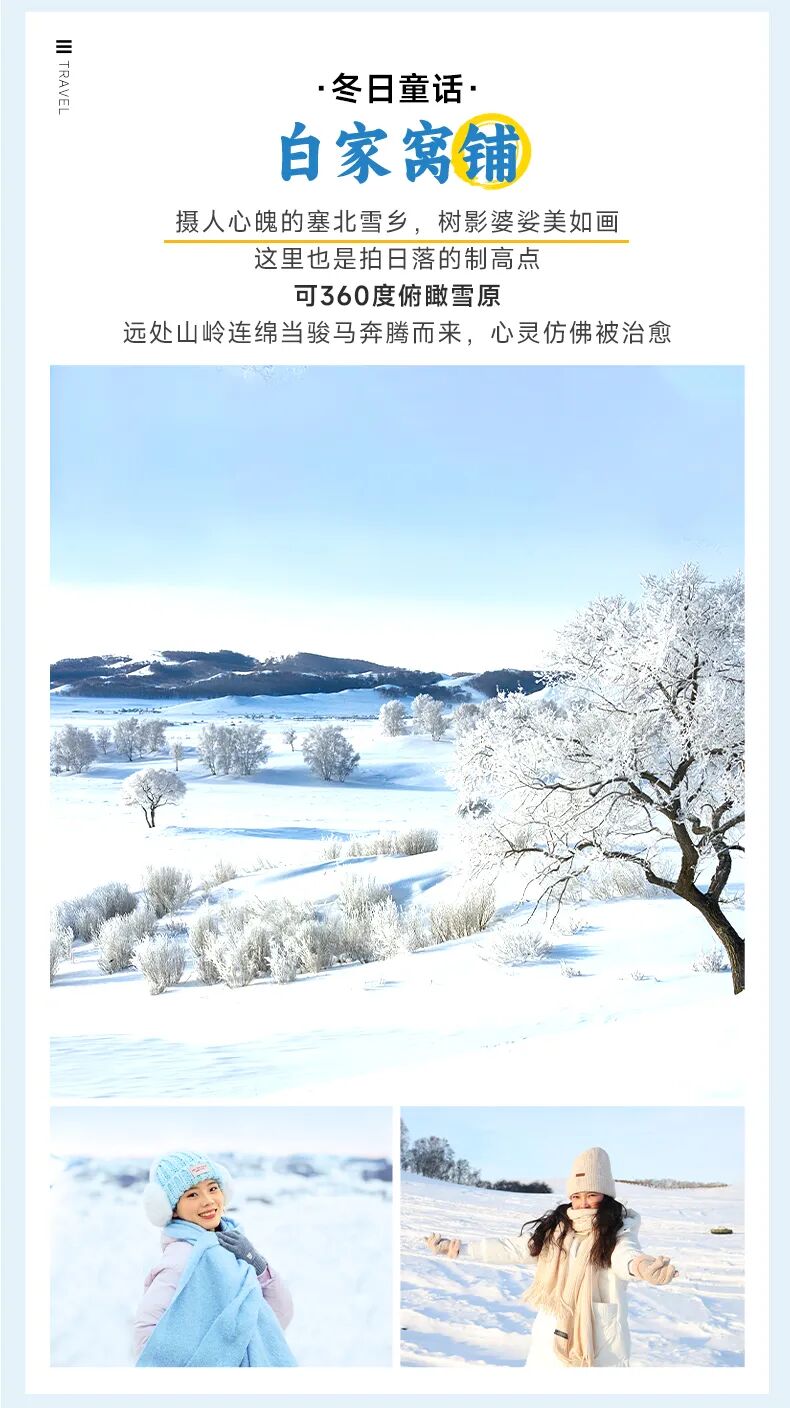 随后返回酒店午餐,稍作休息之后,下午前往【塞北雪乡】【白家窝铺】玩雪、看日落。我们可以堆雪人、打雪仗......多种游玩项目带你找回童年的简单童趣,感受最纯粹的快乐!这里有雪丘之上的排排白桦林,在夕阳照射下白桦树干与白雪争辉,长长的树影拖在雪丘之下,层次分明。