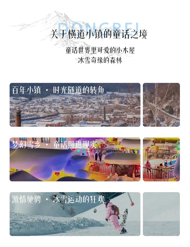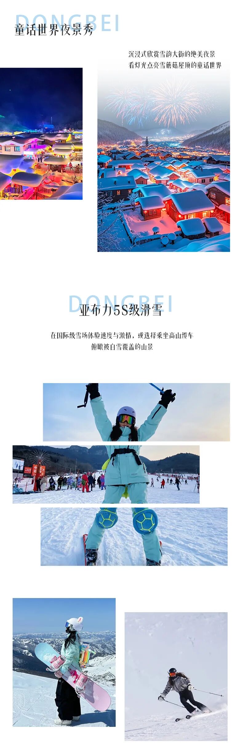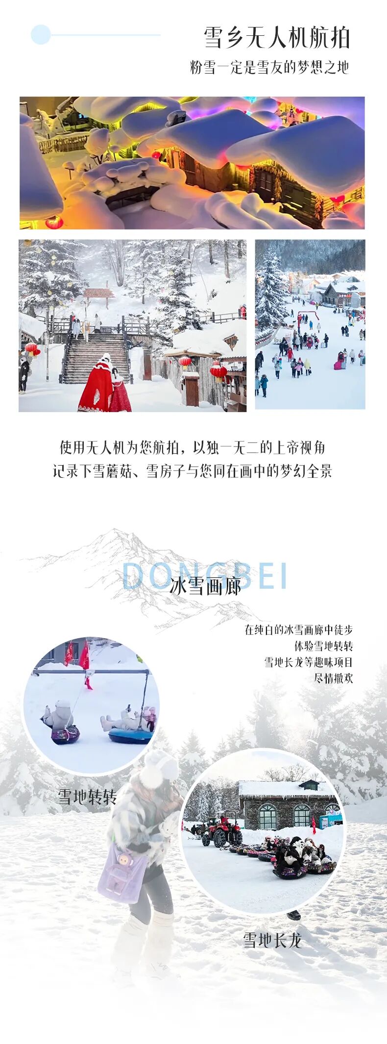 体验 项目 | 百年日式小镇(打卡电影情书里的浪漫)+机车库,亚布力5S滑雪初级道3小时双板(雪板+雪鞋+雪杖使用),马拉爬犁,童话世界夜景秀(雪蘑菇+雪房子),冰雪画廊(雪地转转+雪地长龙) | |