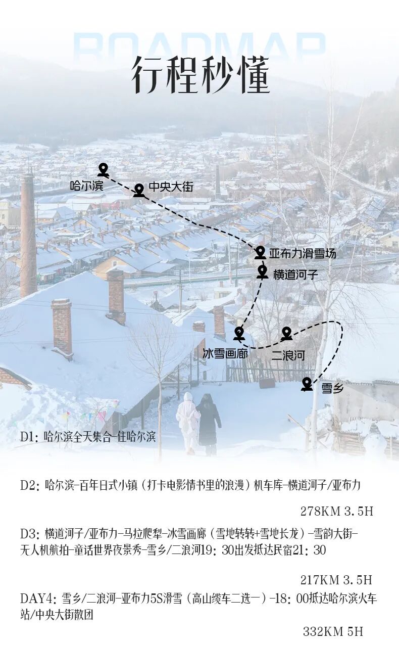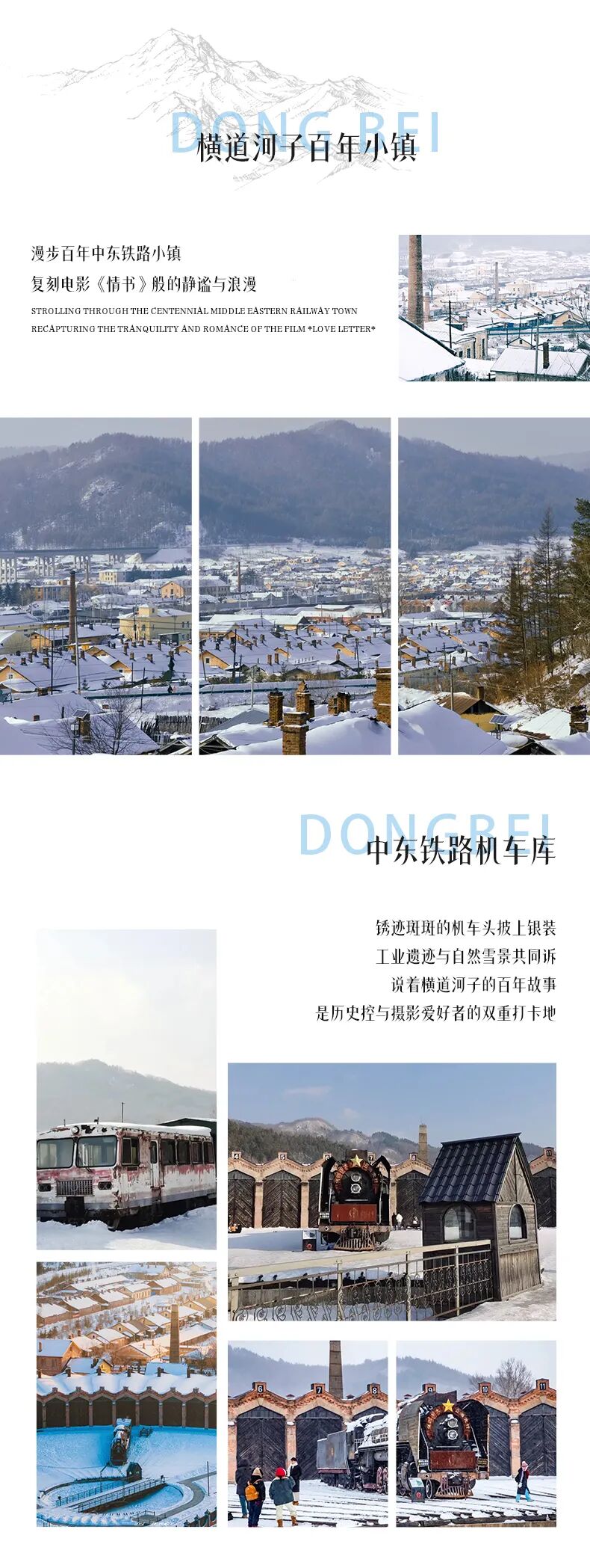 08:00出发百年日式小镇(打卡电影情书里的浪漫)。这座百年日式小镇是《情书》的取景地之一,保留了大量俄式、日式建筑,冬季被白雪覆盖后,氛围感直接拉满。 ![]() 13:00在机车库内,可参观老式蒸汽机车实物和相关展品,了解中东铁路的历史变迁,感受工业时代的印记。 晚上住横道河子/亚布力。 ![]() | ||