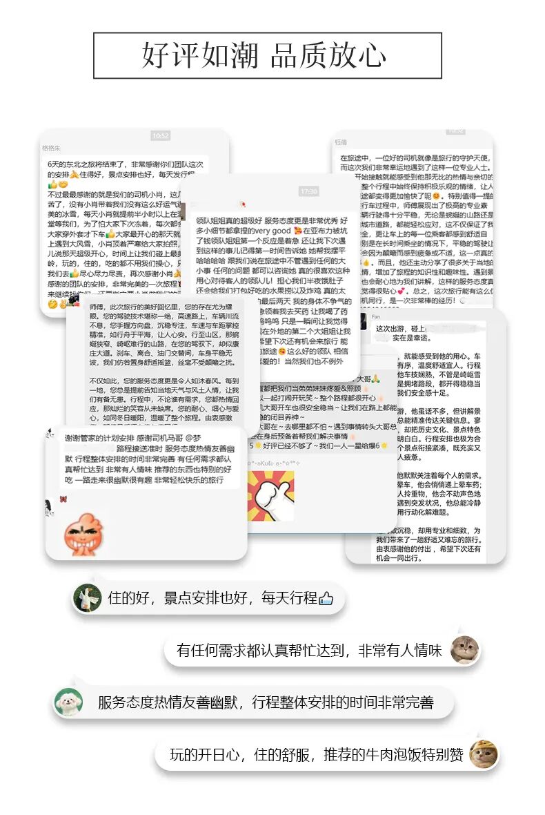 司机兼 向导服务 | 行程内提供驾驶和基础向导服务,非专业导游,可简单讲解聊天,安排景点门票+酒店办理入住,不进收费景区,请保持合理期待 | |