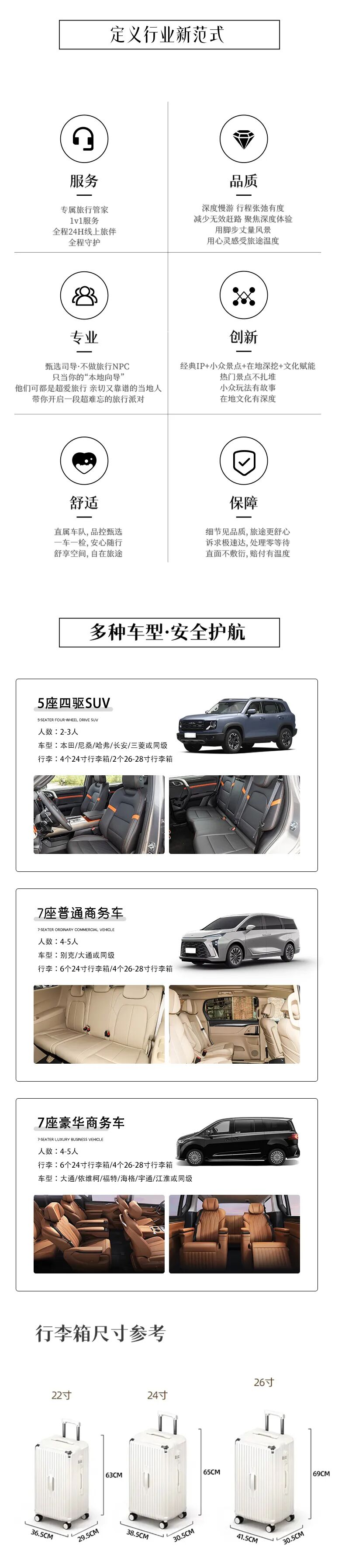 用车 | 根据出行人数选择相对应车型,2-3人5座四驱SUV、4-5人7座商务车,6人大7座商务车,每人限携带一个24寸以内行李箱,如有行李不符问题请提前咨询 | |