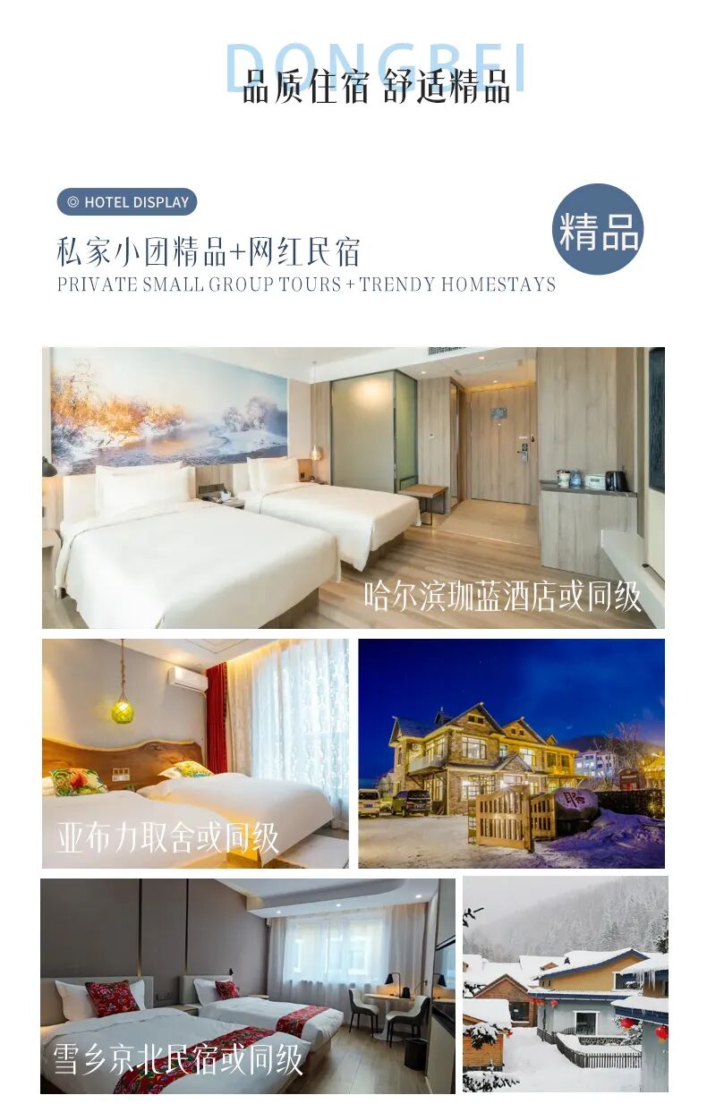 第一晚:哈尔滨珈蓝酒店/中濠悦际/雪黎酒店/凡里酒店/松北瑞辰酒店/智选假日/柏博酒店/中央大街臻途/安悦酒店/瀚瑞酒店或同级 第二晚:亚布力取舍/华夏取舍设计师民宿/颐朵亚雪酒店/良栖青云民宿或同级 第三晚:雪乡京北民宿或同级 | ||