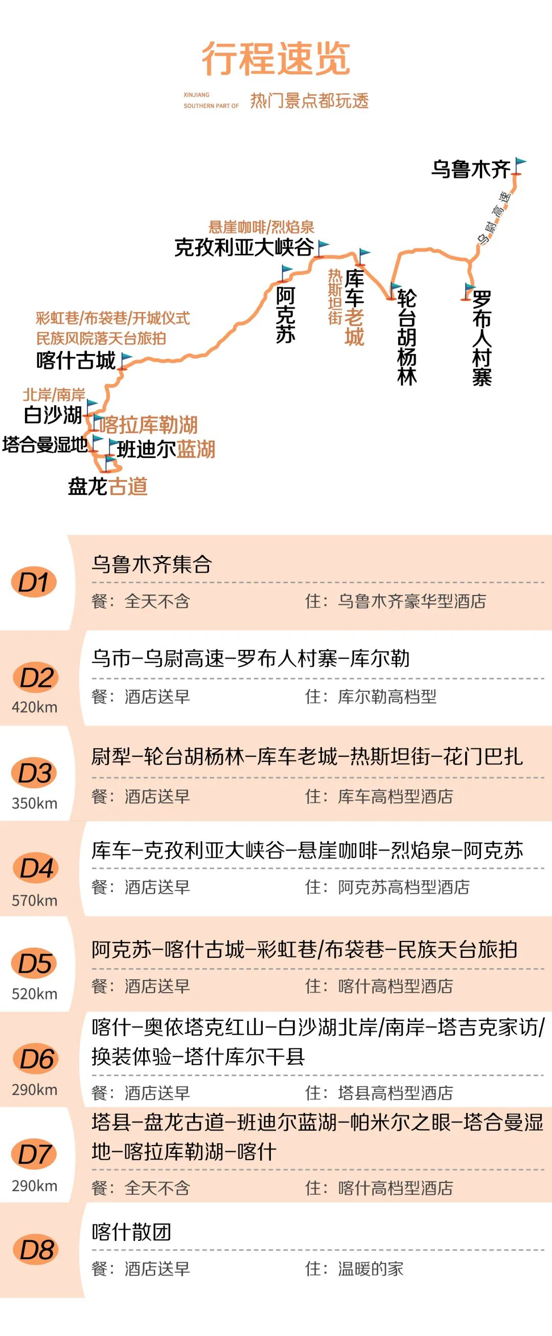 1.如遇乌尉高速公路未通车,则经托克逊-干沟前往罗布人村寨景区,费用不变,敬请谅解。