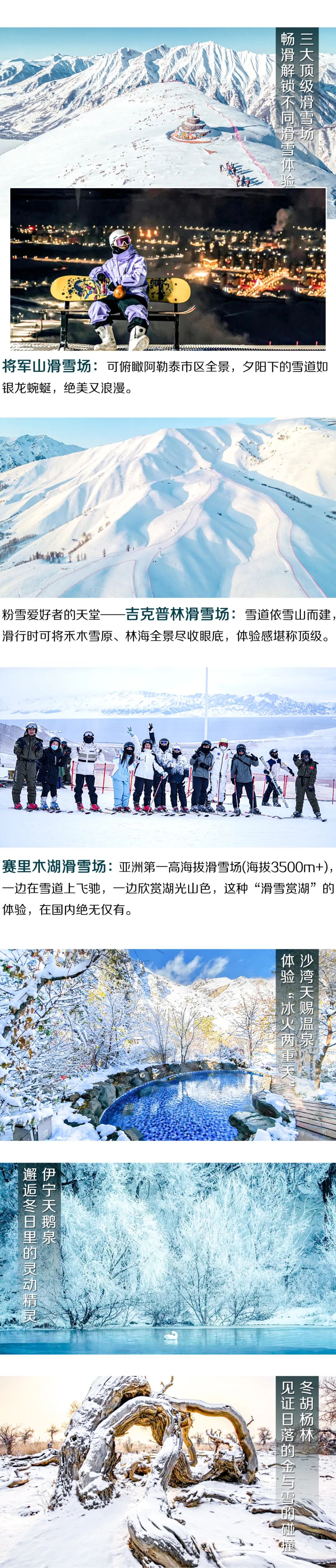 3.门票:将军山滑雪场、禾木吉克普林国际滑雪场及赛里木湖滑雪场滑雪费用及租赁装备费用,以及费用包含以外的其他费用,敬请自理。克拉美丽沙漠公园、乌尔禾胡杨林暂不收费,如遇政策性收费,门票需自理。