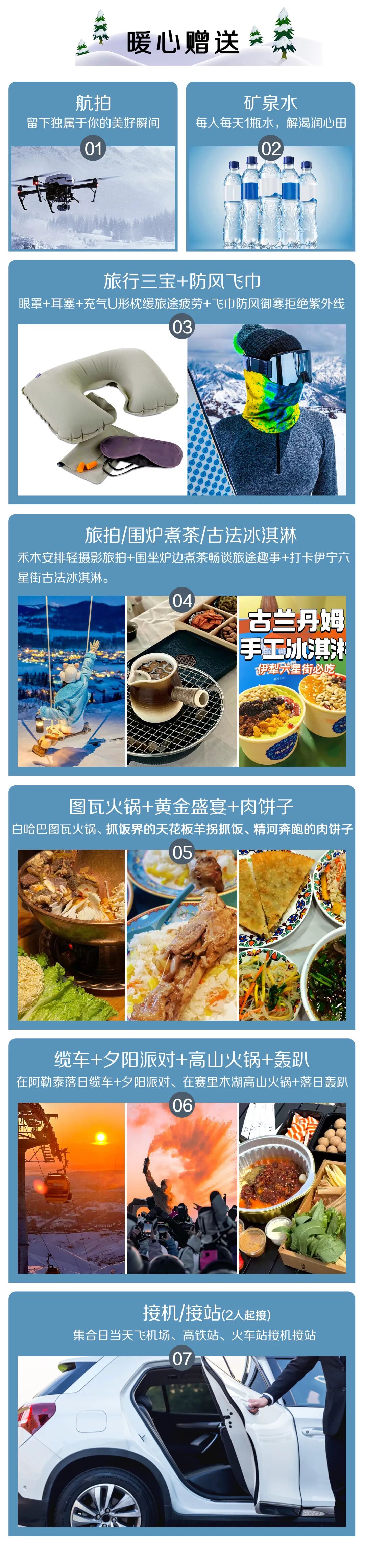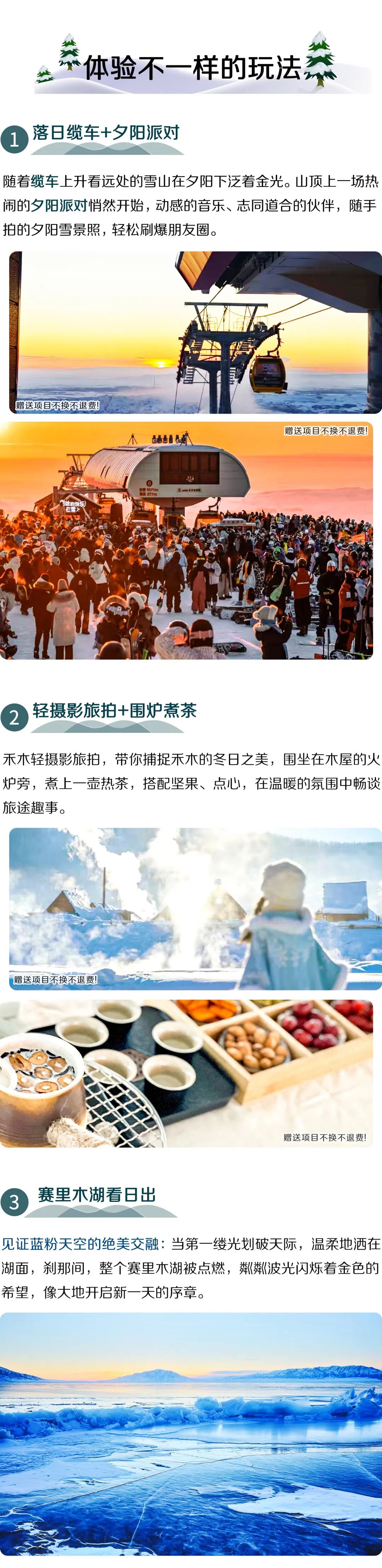 6.禾木旅拍及围炉煮茶为赠送项目,不参加不退费,敬请谅解。