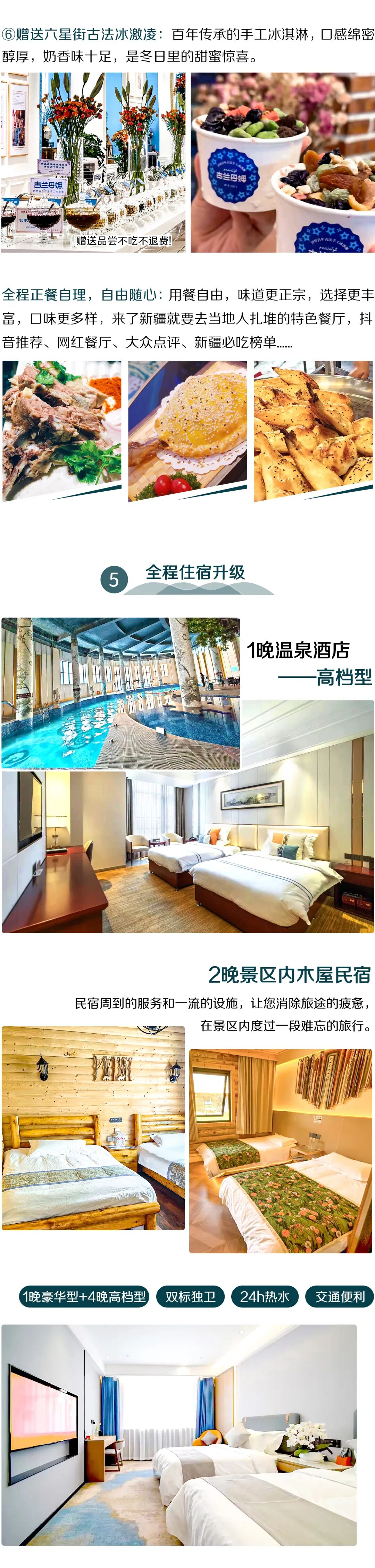 5.全程用餐不含,就是为了让大家有更多的机会去品尝当地美食,市区晚上建议大家三五结伴而行用餐,中午根据情况由司机推荐集体团餐或者路餐,常规午餐人均消费约30-40元左右,晚餐人均消费约40-50元左右,部分景区/住宿地因食材运输等原因,餐食消费较常规人均消费高10-20元左右,(如喀纳斯、禾木、白哈巴等,景区内建议大家集体吃团餐,经济划算)