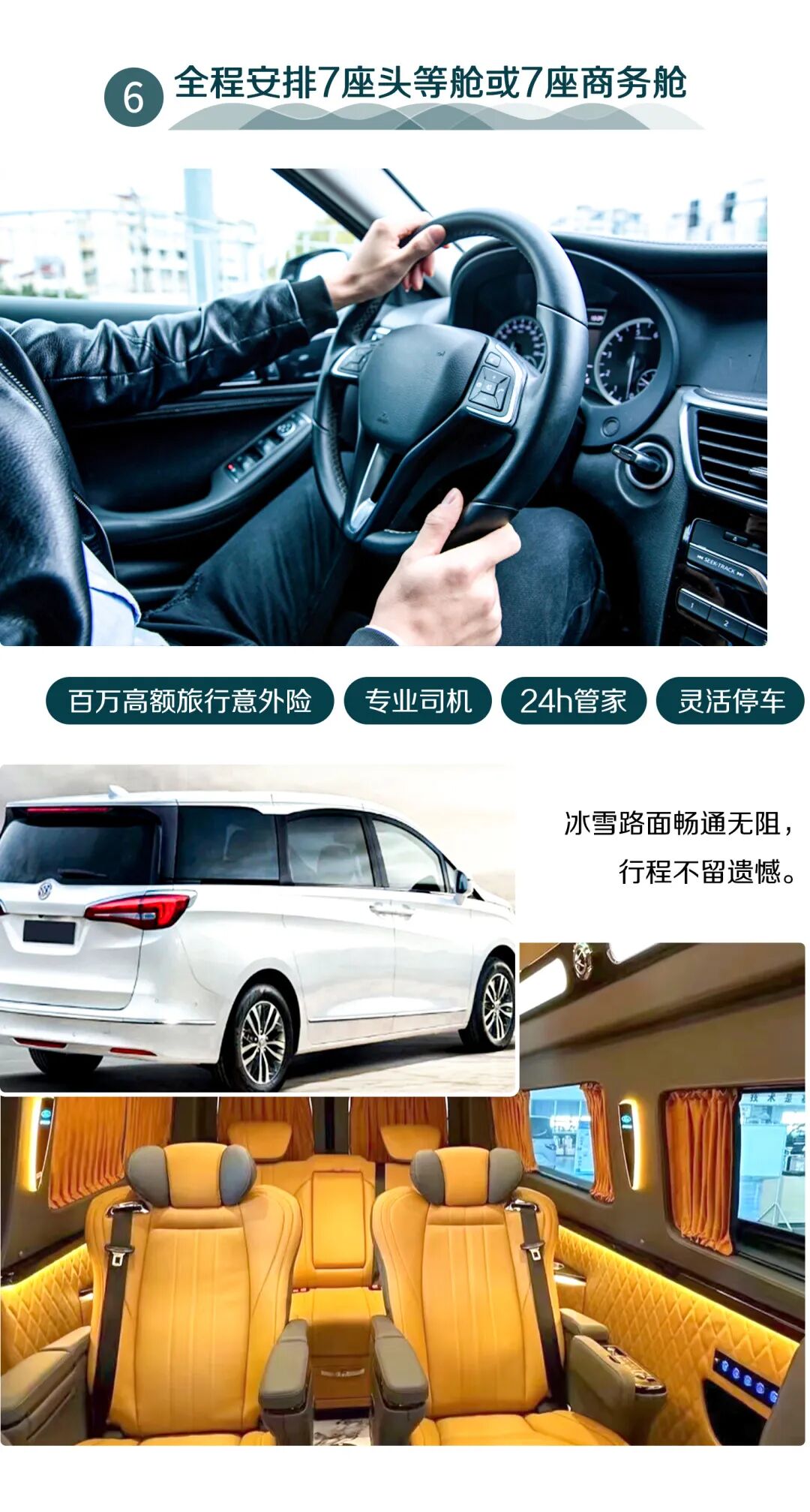4.交通:全程特别安排7座头等舱或7座商务舱,不指定车型(6人安排7座头等舱、4-5人安排7座商务舱,2-3人安排5座SUV),保证一人一正座;(所有座位队员轮换制)