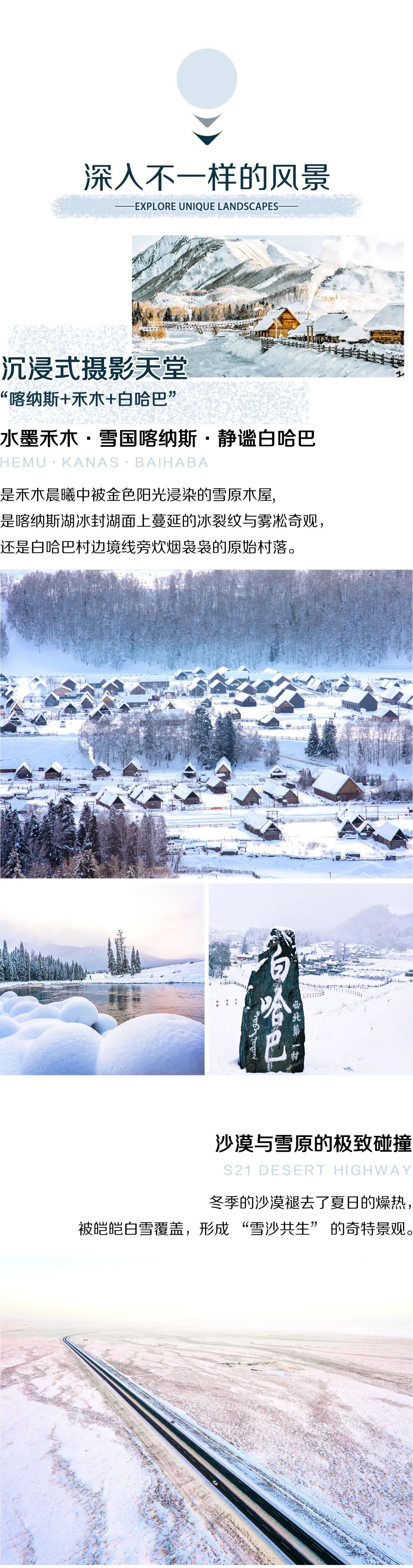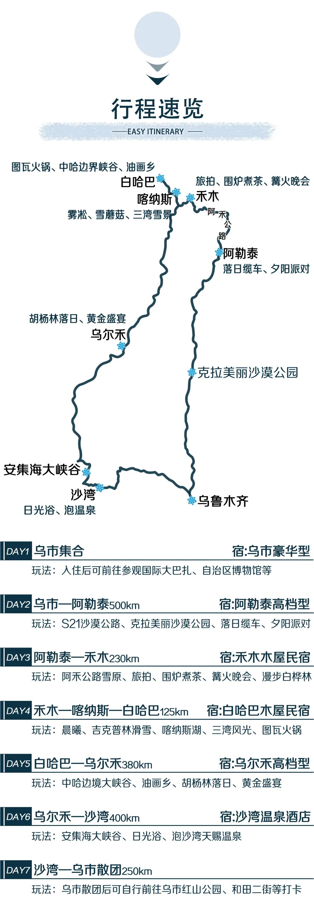 6.如遇三岔口—贾登峪—喀纳斯湖临时交通管制,则启动应急预案:DAY4:禾木—吉克普林滑雪—油画乡—中哈边境大峡谷—白哈巴图瓦火锅晚宴;DAY5:白哈巴—喀纳斯湖—三湾风光—胡杨林(落日)—乌尔禾黄金盛宴。如DAY4+DAY5两天该路段均无法通行,则放弃喀纳斯湖及三湾的游览,费用不变,敬请谅解。