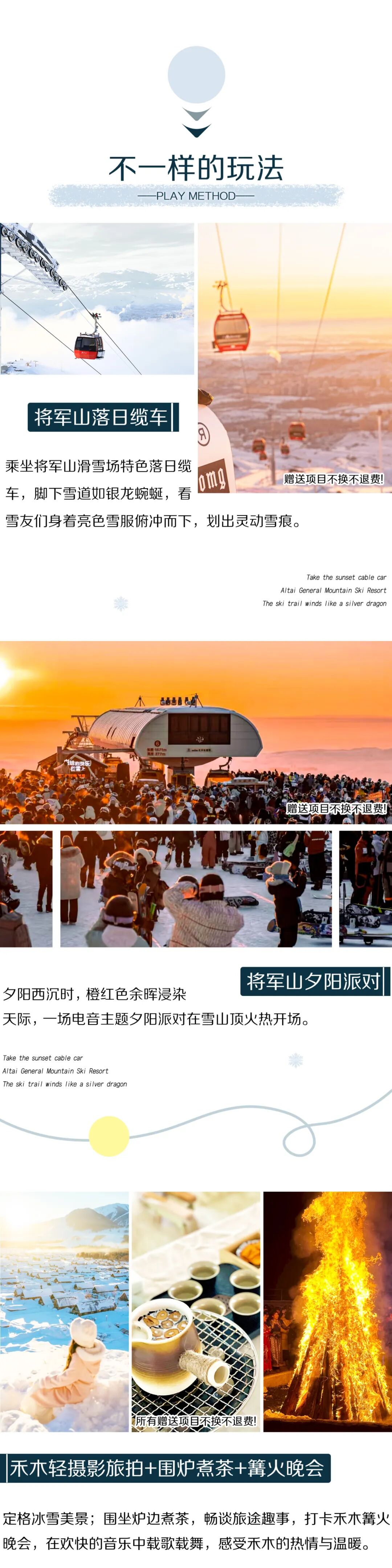 1.如遇极寒天气落日缆车+夕阳派对可能会不开放,以景区通知为准,赠送项目不去不换不退,敬请谅解。