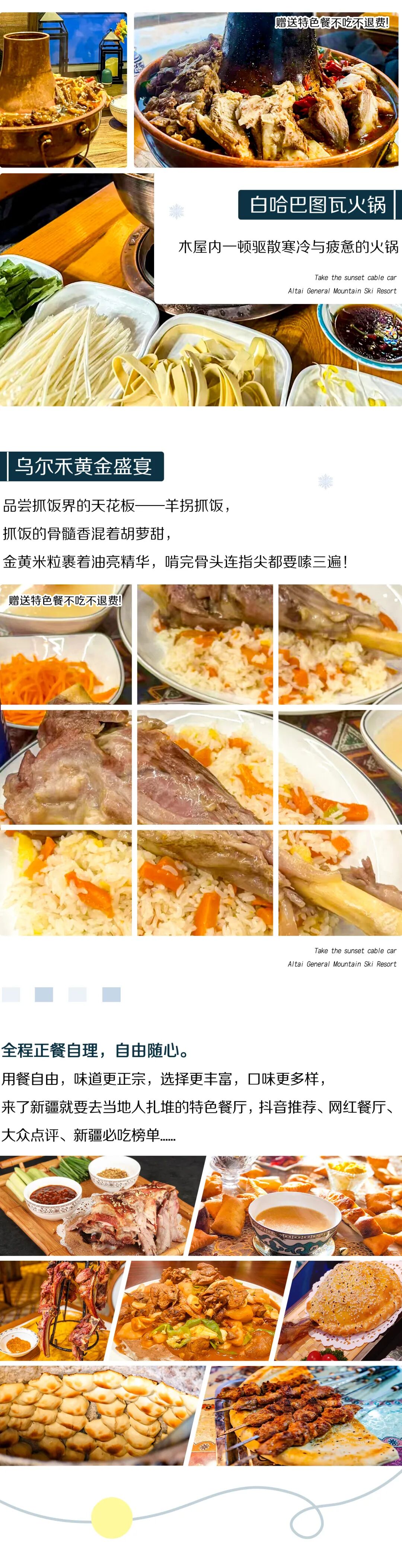 7.白哈巴图瓦火锅晚宴为赠送项目,如因天气等不可抗力无法前往白哈巴,不吃不退,敬请谅解。