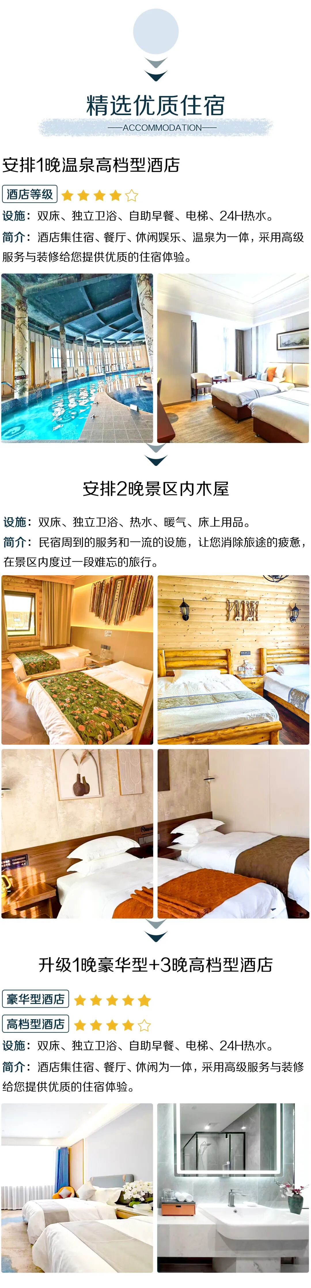 3. 住宿:全程共6晚住宿(豪华型为携程五钻或当地五星,高档型为携程四钻或当地四星,舒适型为携程三钻或两钻或当地三星)