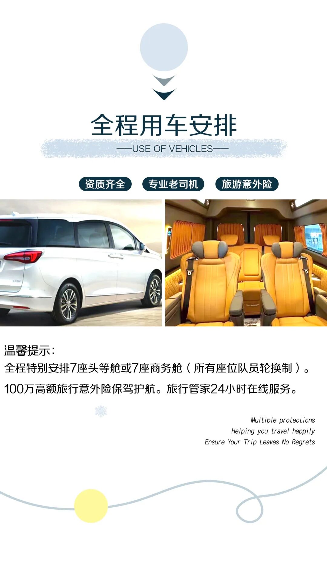 4. 交通:全程特别安排7座头等舱或7座四商务舱,不指定车型(6人安排7座头等舱、4-5人安排7座商务舱,2-3人安排5座SUV),保证一人一正座;(所有座位队员轮换制)