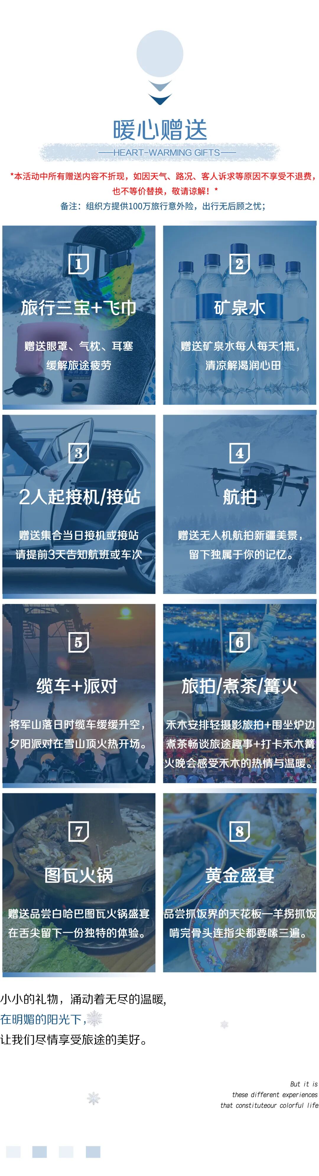 6.禾木旅拍及围炉煮茶为赠送项目,不参加不退费,敬请谅解。