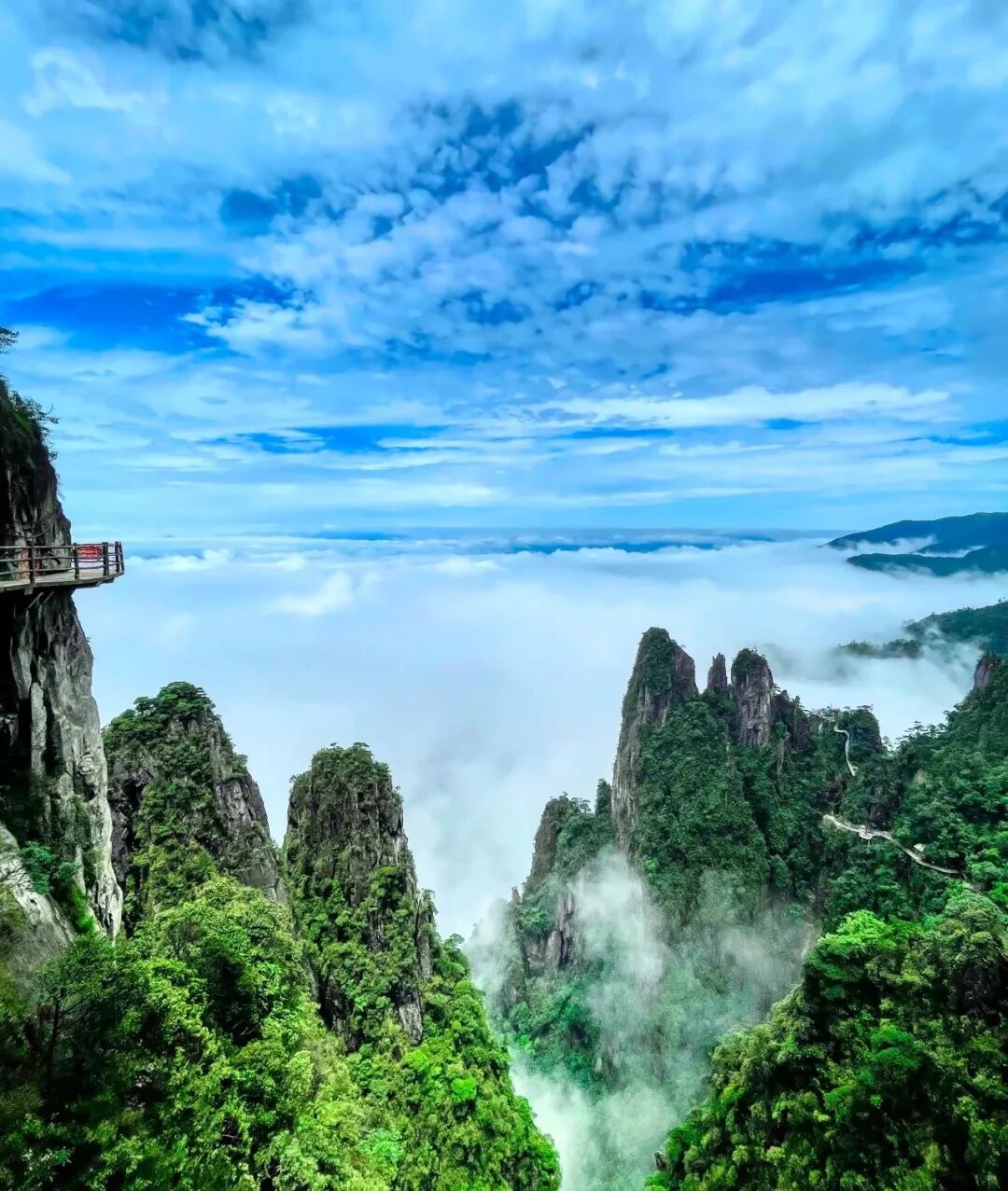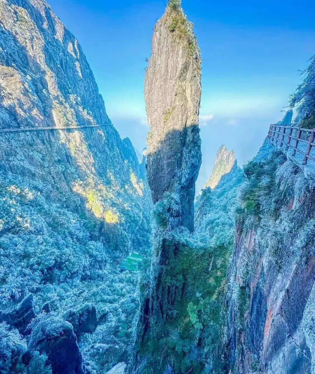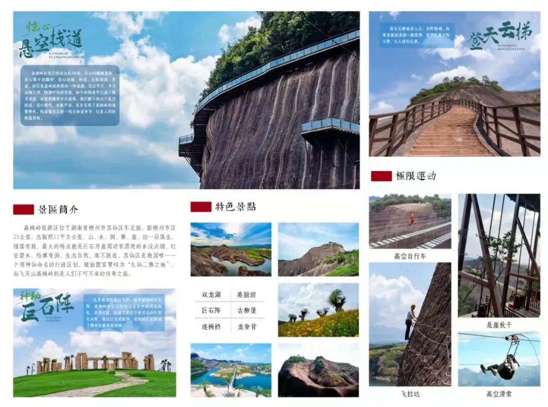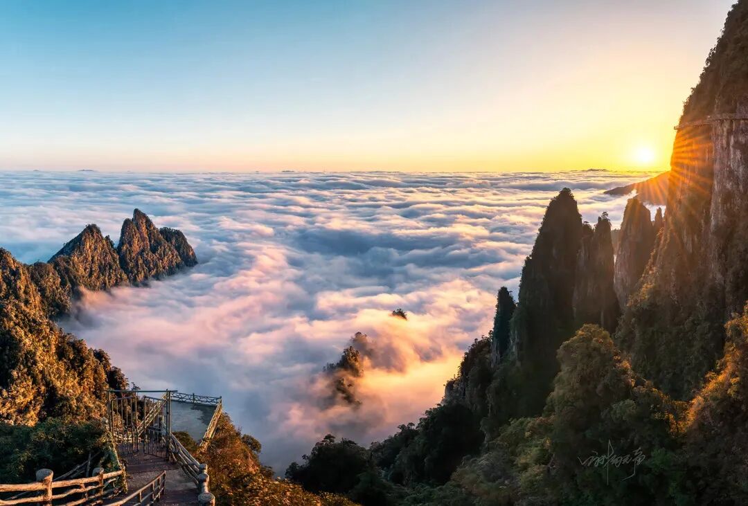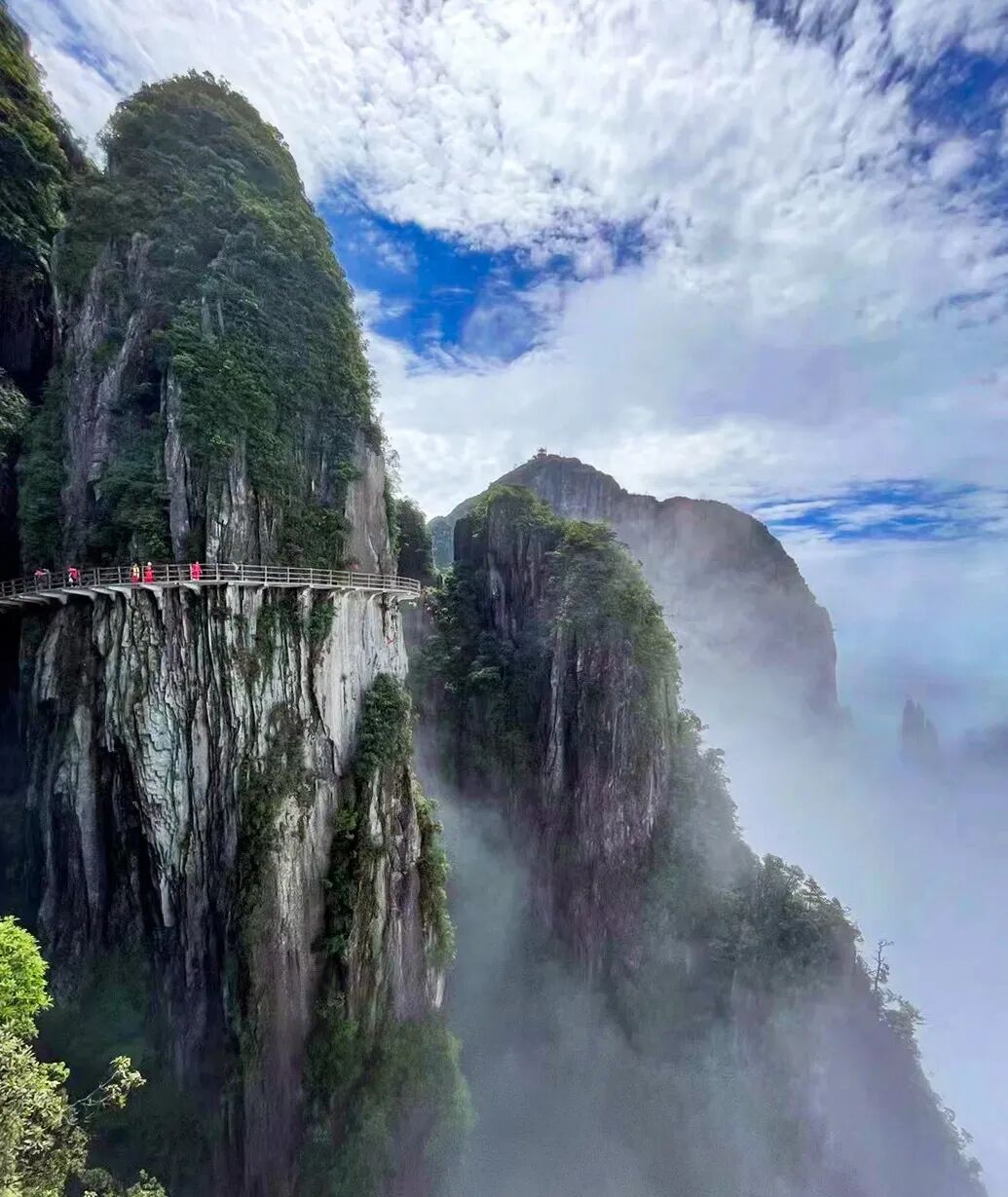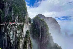 10:30 深度游览五指峰景区,漫步悬空栈道,南中国最长的悬空栈道;总长约8公里,海拔1400米至1600米,两层栈道,全程无障碍观光环线,登高山、临绝壁如履平地,尽享“非人”奇遇。