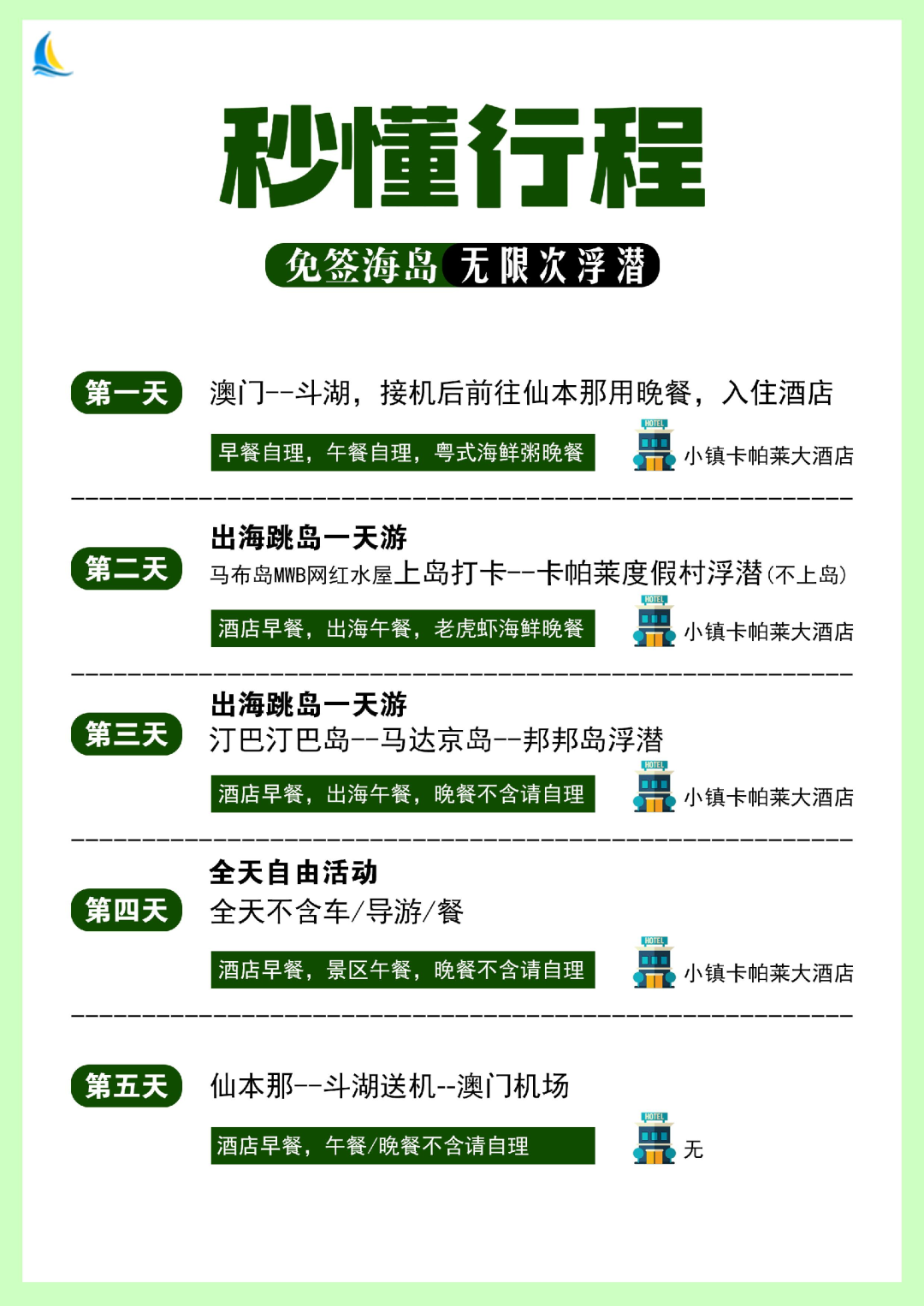 5、行程所含的两天出海跳岛,含快艇,出海含午餐/打包简餐,含浮潜工具(面罩/咬嘴);