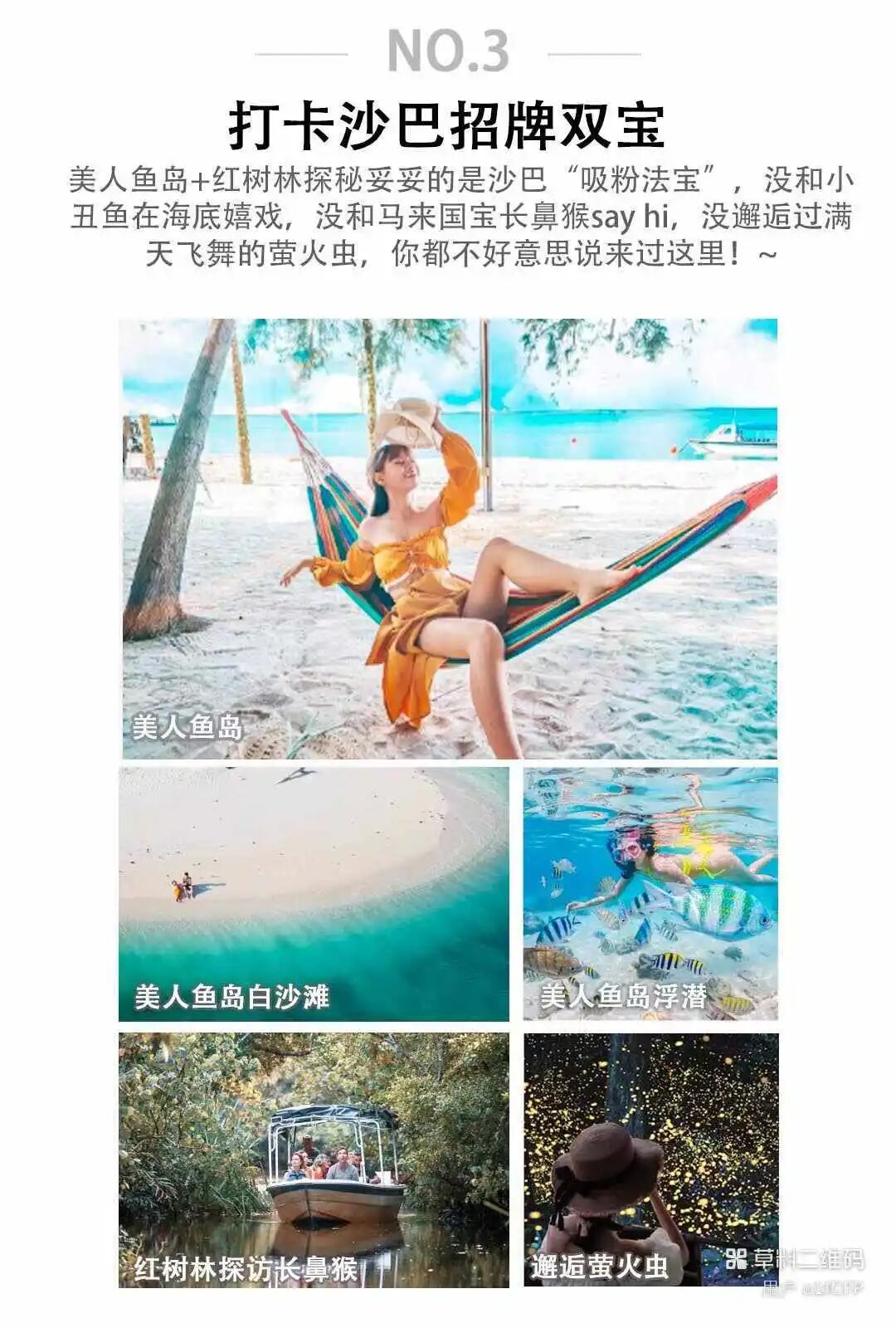 不用说都知道马代是海岛控的心头好,但昂贵的花费也劝退了不少人。没关系,来沙巴的美人鱼岛吧,这里就是你马代的优惠版平替,你朝思暮盼的蓝天绿树,水清沙白……在美人鱼岛同样可以满足你!别不信,天气好的时候,这里的泻湖是果冻般的青蓝,沙质更是面粉般的细腻,光脚踩也很舒服,而且在岛的东面还隐藏着一条拖尾沙滩,甚至在某些季节,这里也可以看到荧光“蓝眼泪”…..这不,马代的几大元素人家都给你整齐活了,还不值得你来?!当然了,美人鱼岛开发较晚,一切都保持着原始动人的模样,没有过多的水上机动,甚至连手机信号也不好!不过,这也正好嘛,你不用担心被电话拉回到尘嚣俗扰当中,安安静静地在这里做一天遁世浪人吧!
